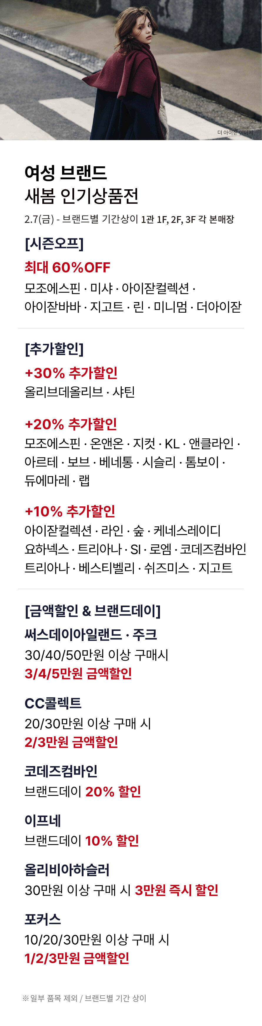 [여성브랜드] 새봄 인기상품전 기간 : 2025-02-07 ~ 각 브랜드 별 기간 상이 위치 : 1관 1F, 2F, 3F 각 브랜드 본매장 ▲ 대중교통 생활화 캠페인 다음글이 없습니다.