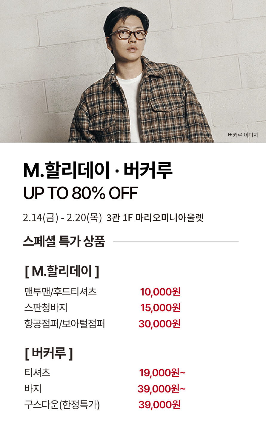 [M.할리데이 · 버커루] UP TO 80% OFF 기간 : 2025-02-14 ~ 2025-02-20 위치 : 3관 1F 마리오미니아울렛 ▲ 대중교통 생활화 캠페인 다음글이 없습니다.