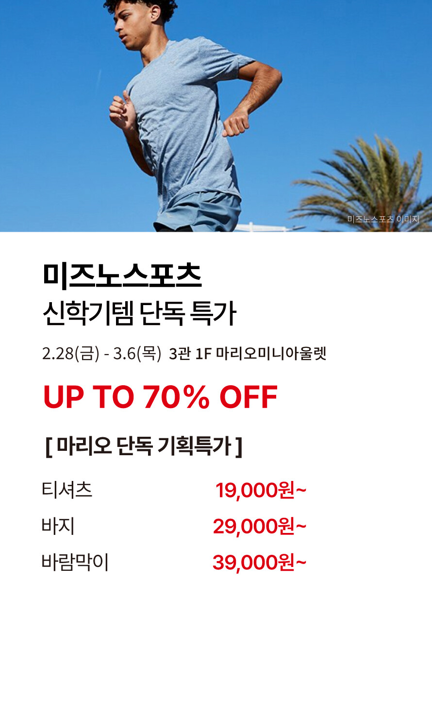 [미즈노스포츠] 신학기템 단독 특가 기간 : 2025-02-28 ~ 2025-03-06 위치 : 3관 1F 마리오미니아울렛 ▲ 2025년 9월 마리오아울렛 X 연천허브빌리지 경품행사 당첨자 발표 ▼ 대중교통 생활화 캠페인
