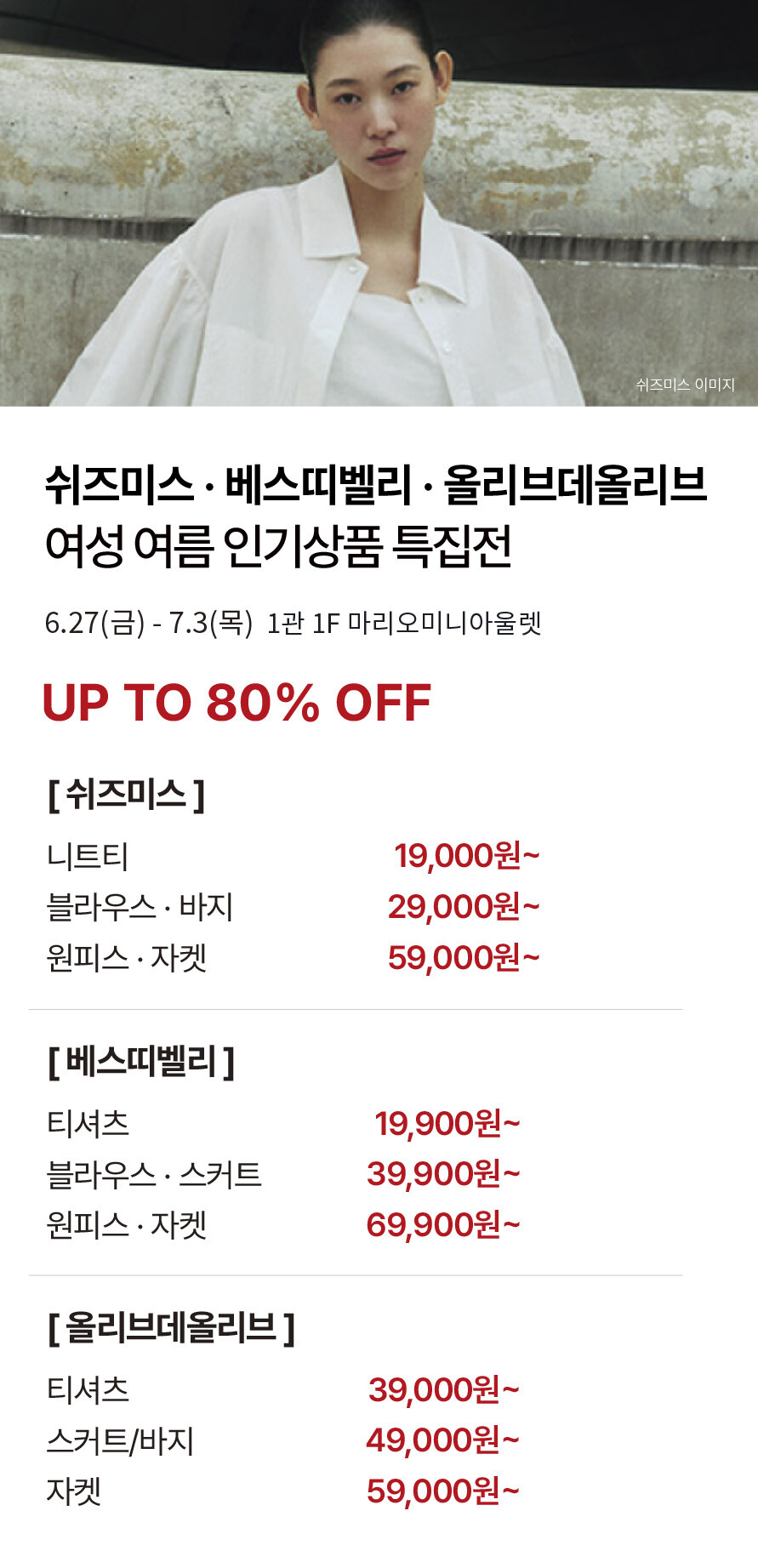 [쉬즈미스 · 베스띠벨리 · 올리브데올리브] 여성 여름 인기상품 특집전 기간 : 2025-06-27 ~ 2025-07-03 위치 : 1관 1F 마리오미니아울렛 ▲ 대중교통 생활화 캠페인 다음글이 없습니다.