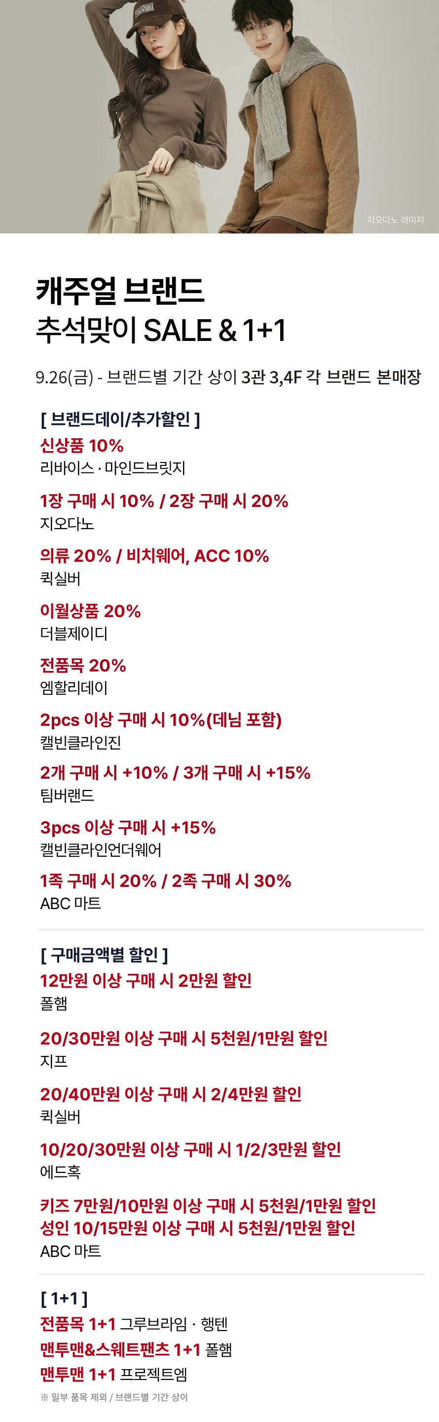 [캐주얼] 추석맞이 SALE & 1+1 기간 : 2025-09-26 ~ 각 브랜드 별 기간 상이 위치 : 3관 3,4F 각 본매장 ▲ [키즈] 추석마중 가을/겨울 준비전 ▼ [ST듀퐁 · 닥스셔츠 · 레노마셔츠] 웨딩시즌 남성셔츠 구매찬스