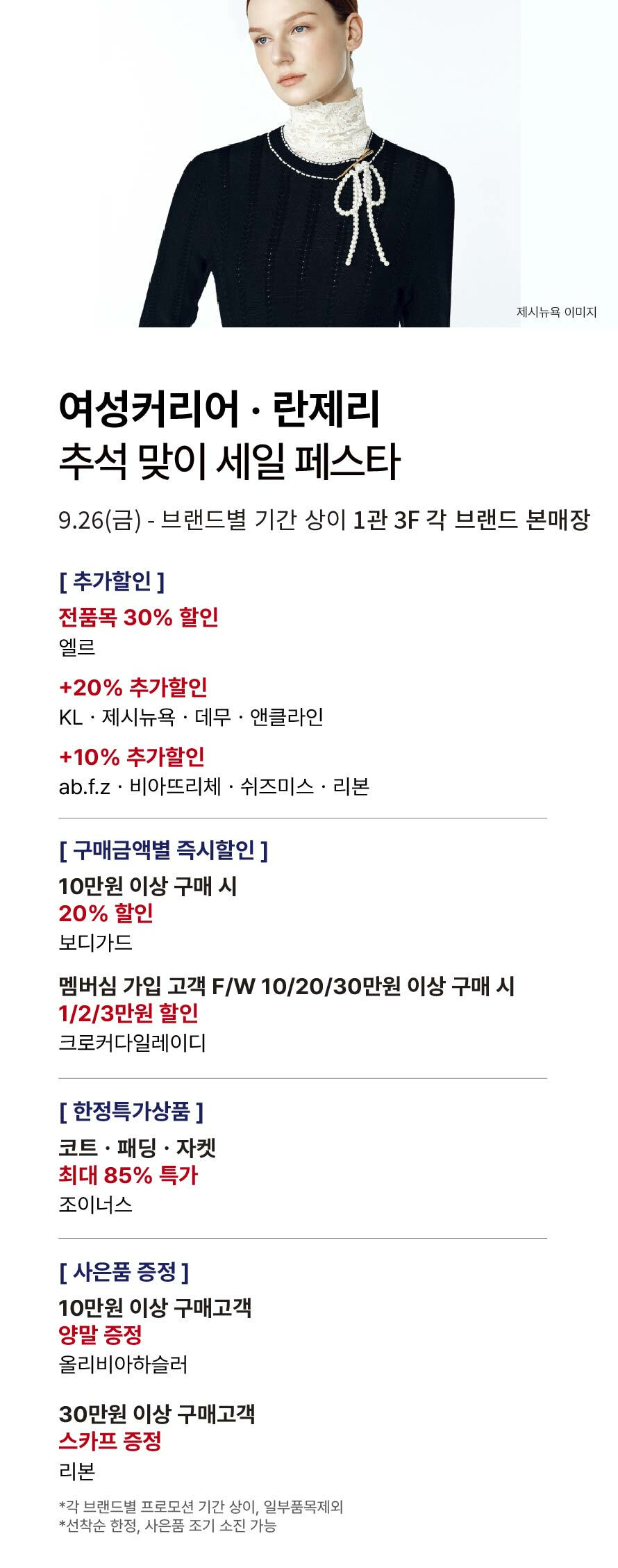 [여성커리어&란제리] 추석맞이 세일 페스타 기간 : 2025-09-26 ~ 2025-10-02 위치 : 1관 3F 각 본매장 ▲ [영캐주얼&제화] 추석맞이 세일 페스타 ▼ [아가방갤러리] 가을맞이 창고 大개방
