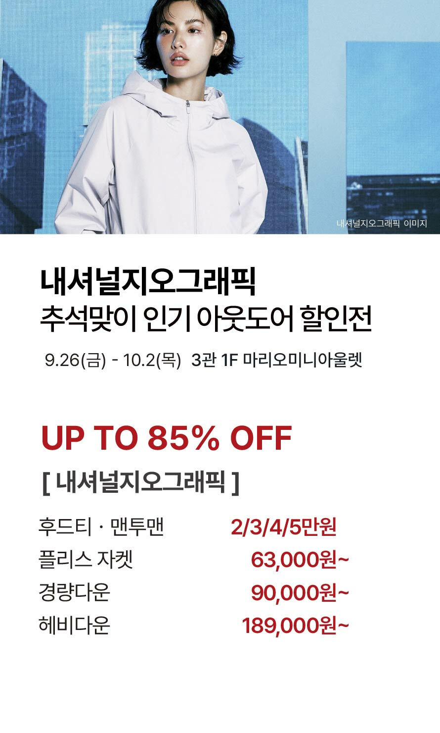 [내셔널지오그래픽] 추석맞이 인기 아웃도어 할인전 기간 : 2025-09-26 ~ 2025-10-02 위치 : 3관 1F 마리오미니아울렛 ▲ [다이나핏] 스포츠 의류 특별 균일가전 ▼ [여성캐릭터&잡화] 추석맞이 세일 페스타
