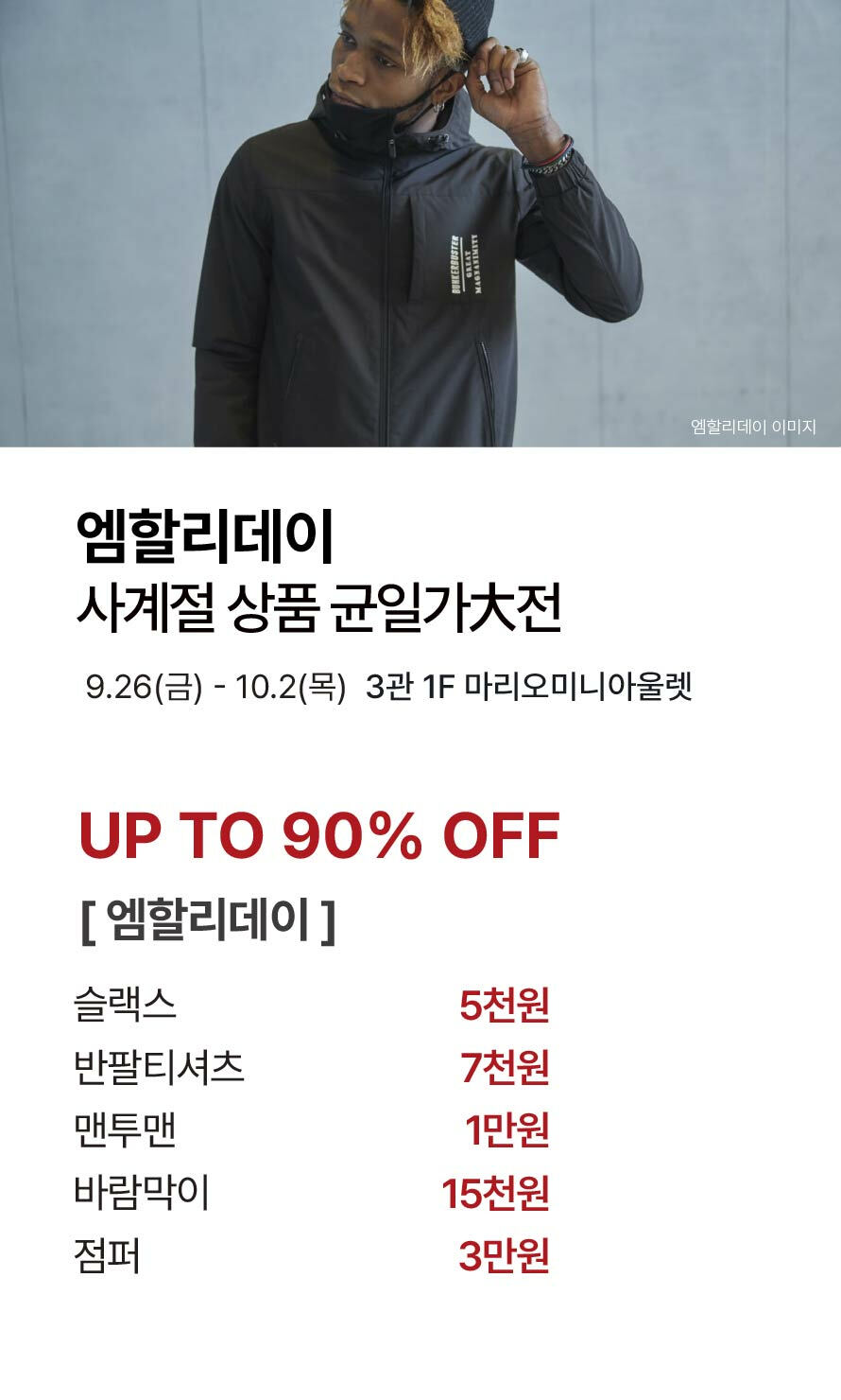 [엠할리데이] 사계절 상품 균일가大전 기간 : 2025-09-26 ~ 2025-10-02 위치 : 3관 1F 마리오미니아울렛 ▲ [헤지스 · 닥스헤지스골프 · 닥스ACC] 추석맞이 LF그룹 특가대전 ▼ [다이나핏] 스포츠 의류 특별 균일가전