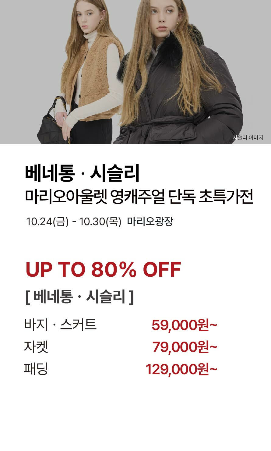 [베네통·시슬리] 마리오아울렛 영캐주얼 단독 초특가전 기간 : 2025-10-24 ~ 2025-10-30 위치 : 마리오광장 ▲ [라코스테] 주말 한정 프로모션 ▼ Mario Outlet Tax-Free Shopping Guide