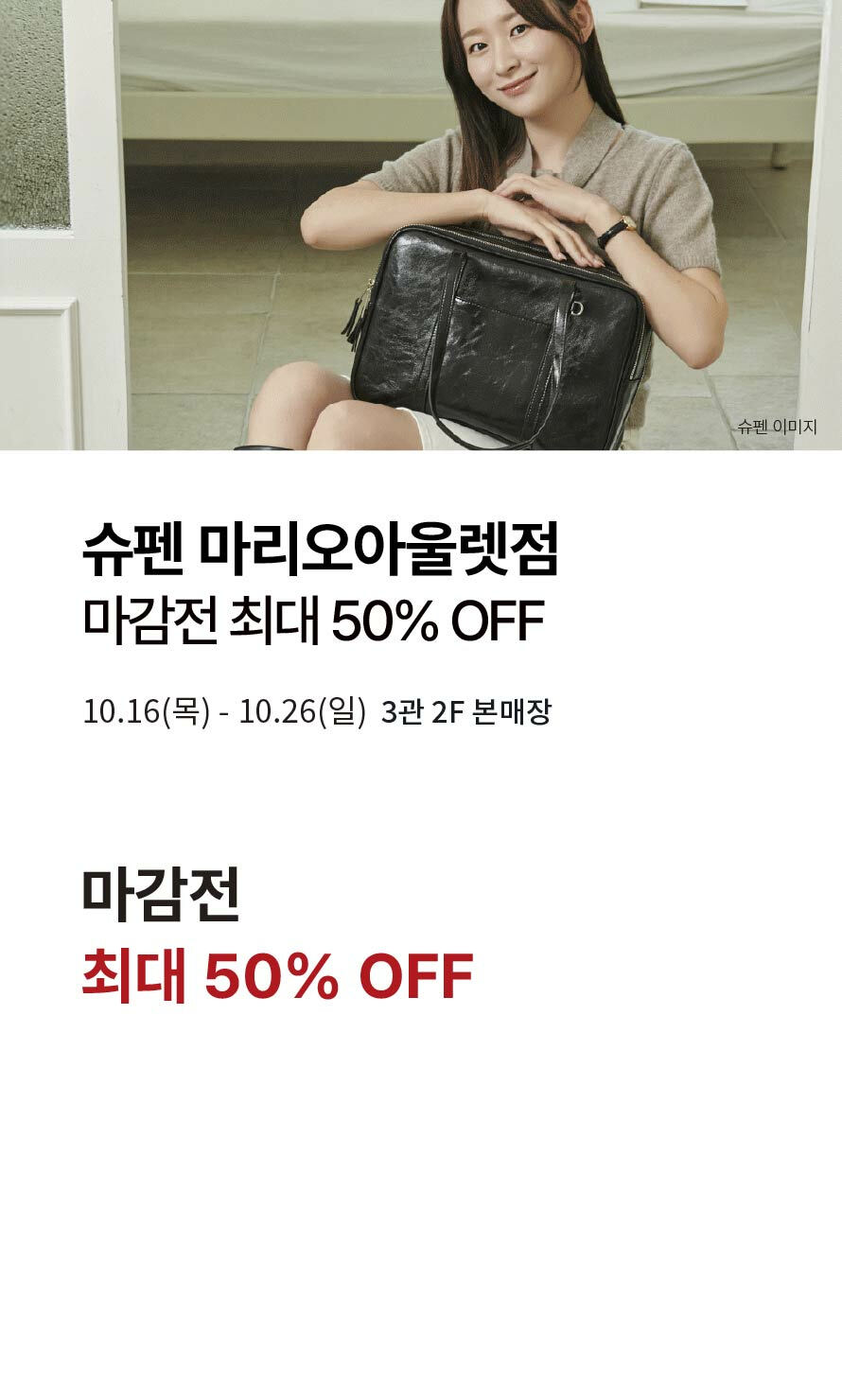 [슈펜 마리오아울렛점] 마감전 최대 50% OFF 기간 : 2025-10-16 ~ 2025-10-26 위치 : 3관 2F 본매장 ▲ [풋마트·밸롭] 슈즈 인기상품 특가전 ▼ [라코스테] 주말 한정 프로모션