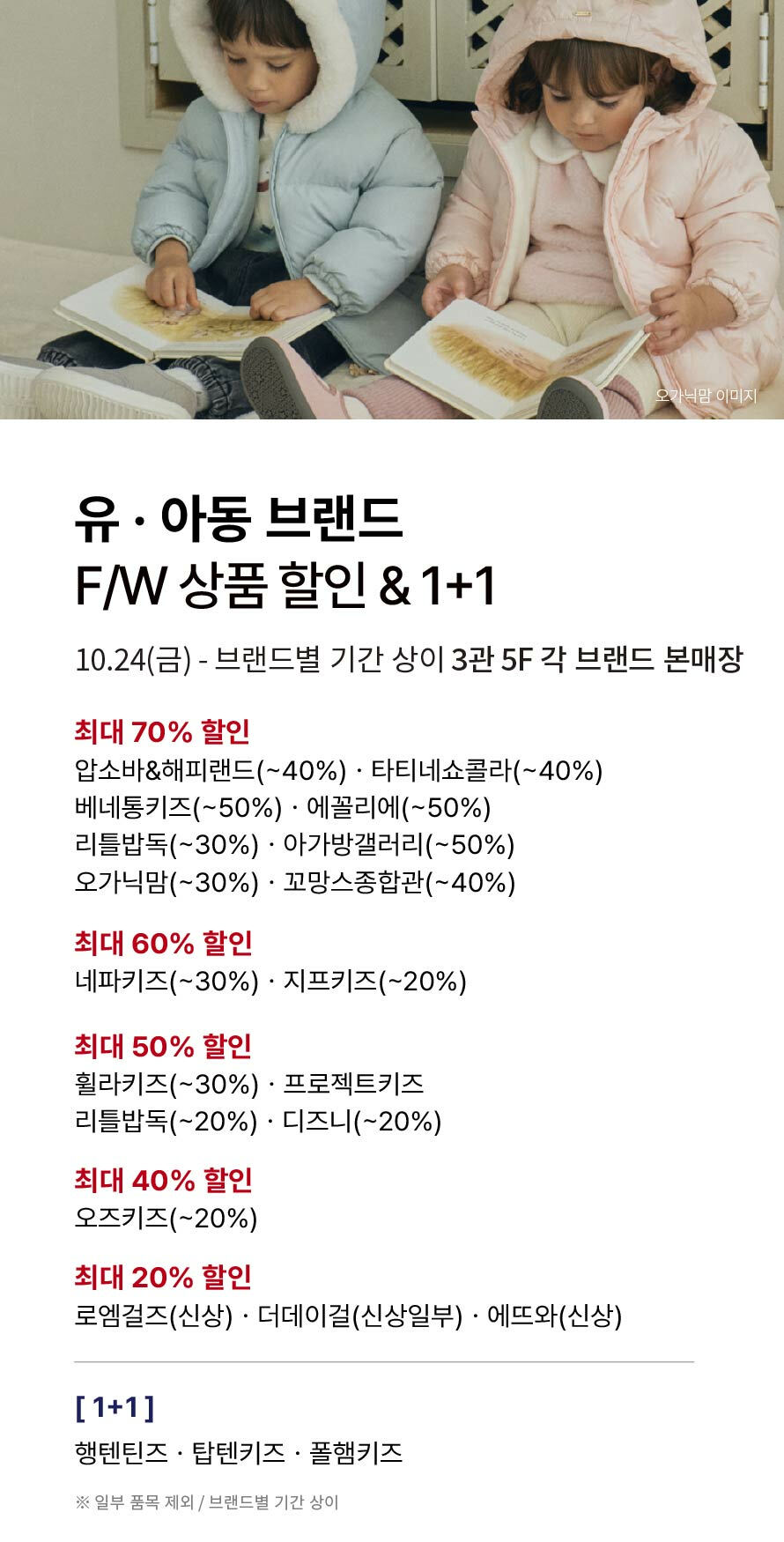 [유·아동] F/W 상품 할인 & 1+1 기간 : 2025-10-24 ~ 각 브랜드 별 기간 상이 위치 : 3관 5F 각 본매장 ▲ [캐주얼] F/W 상품 할인 & 1+1 ▼ [풋마트·밸롭] 슈즈 인기상품 특가전