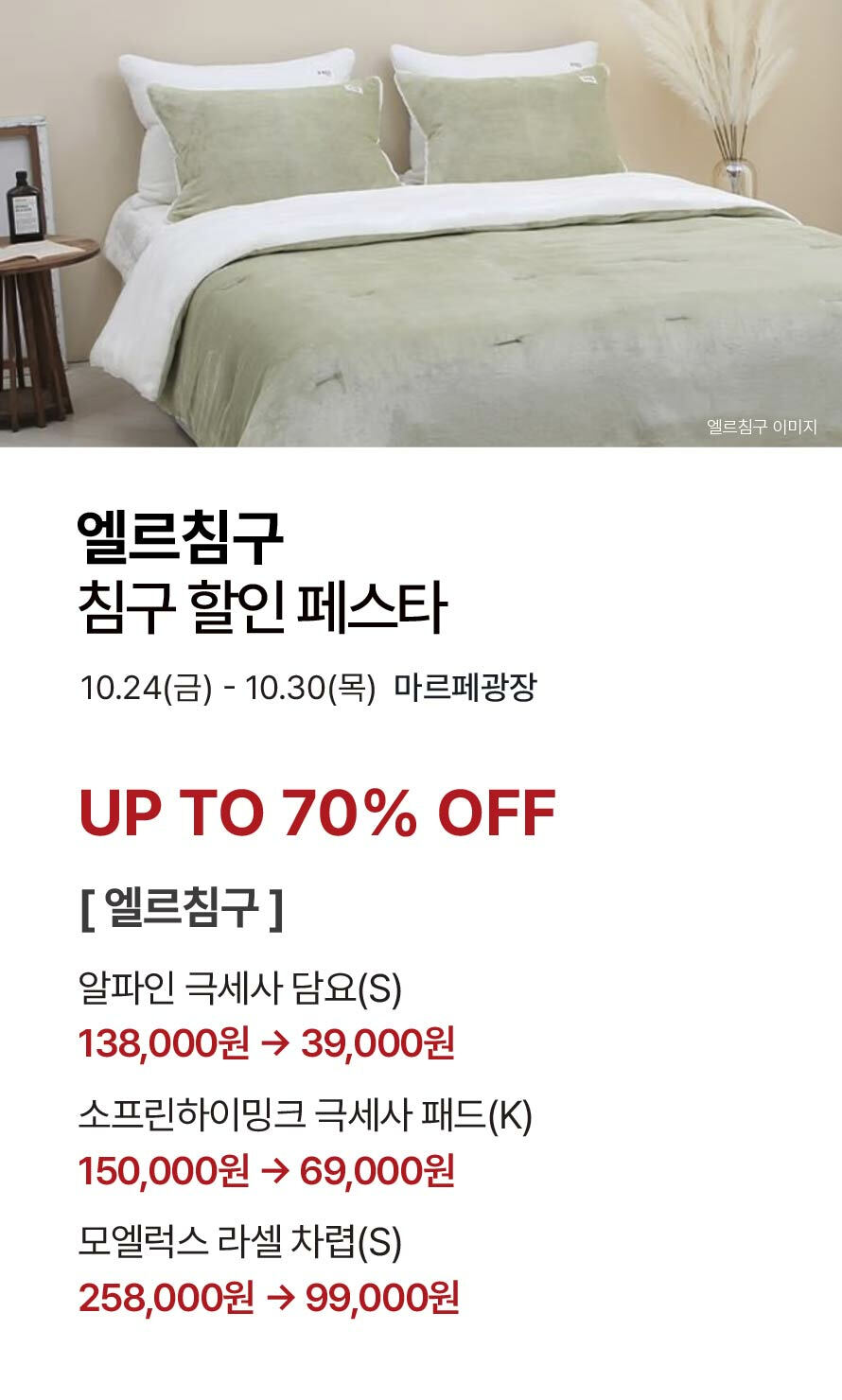 [엘르침구] 침구 할인 페스타 기간 : 2025-10-24 ~ 2025-10-30 위치 : 마르페광장 ▲ [아이잗바바·BCBG·올앤선드리] 여성패션 가을 베스트템 특가전 ▼ [캐주얼] F/W 상품 할인 & 1+1