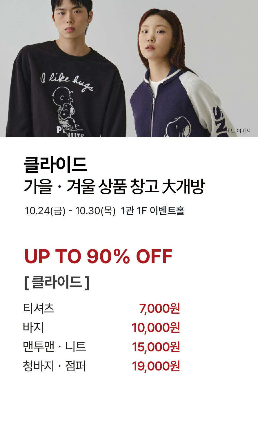 [클라이드] 가을/겨울 상품 창고 大개방 기간 : 2025-10-24 ~ 2025-10-30 위치 : 1관 1F 이벤트홀 ▲ [레디포넥스트] 마리오아울렛 단독 균일가 대전 ▼ [프로젝트엠·NBA] 가을/겨울 상품 특가전