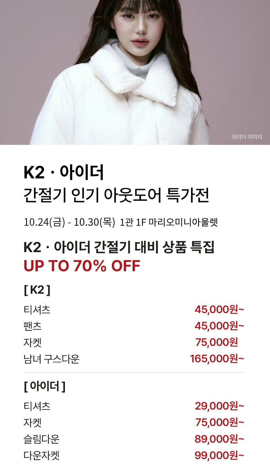 [케이투·아이더] 간절기 인기 아웃도어 특가전 기간 : 2025-10-24 ~ 2025-10-30 위치 : 1관 1F 마리오미니아울렛 이전글이 없습니다. ▼ [행텐·행텐틴즈 패밀리전] 가을/겨울 상품 균일가 특집