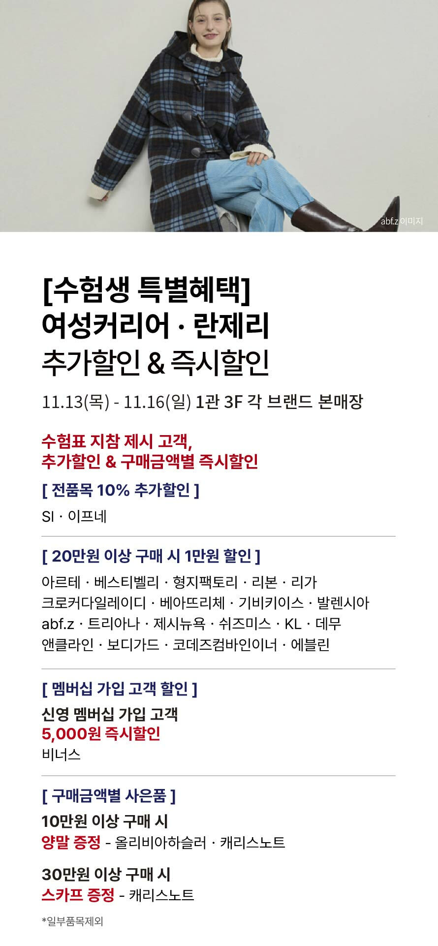 [여성 커리어·란제리] 수험생 특별혜택 추가할인 & 즉시할인 기간 : 2025-11-13 ~ 2025-11-16 위치 : 1관 3F 각 본매장 ▲ 대중교통 생활화 캠페인 다음글이 없습니다.