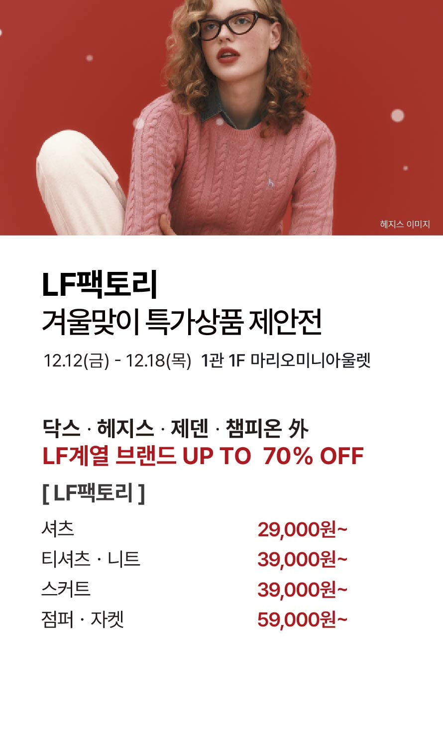 [LF팩토리] 겨울맞이 특가상품 제안전 기간 : 2025-12-12 ~ 2025-12-18 위치 : 1관 1F 마리오미니아울렛 ▲ [미샤] 가을/겨울 상품 시즌오프 ▼ [스파오] 오픈 예정 기념 특별 초대전!