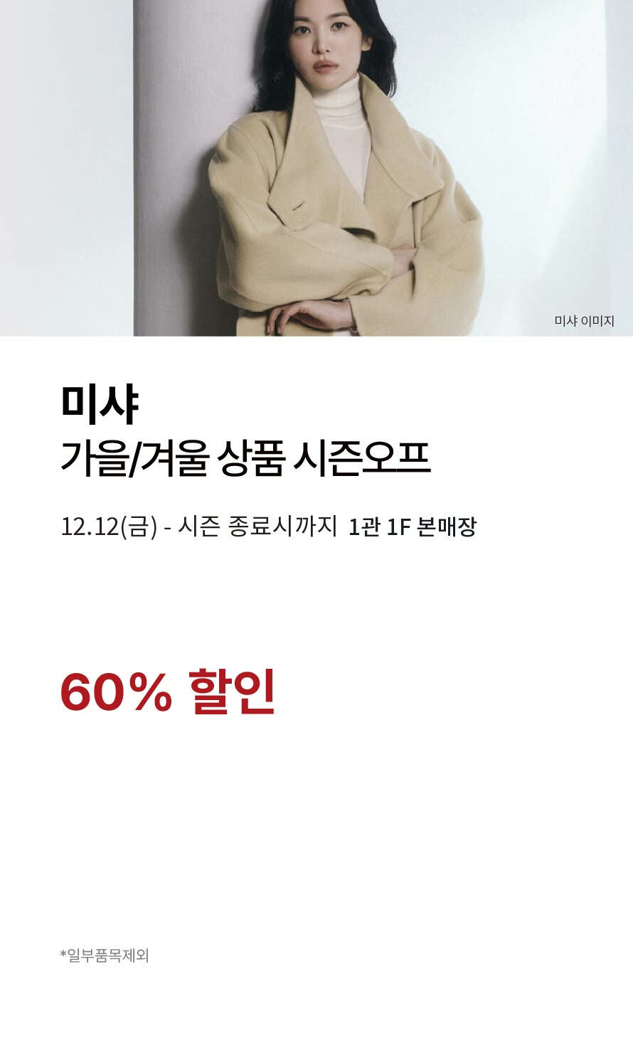 [미샤] 가을/겨울 상품 시즌오프 기간 : 2025-12-12 ~ 시즌 종료 시까지 위치 : 1관 1F 본매장 ▲ [모조에스핀] 가을/겨울 상품 시즌오프 ▼ [LF팩토리] 겨울맞이 특가상품 제안전
