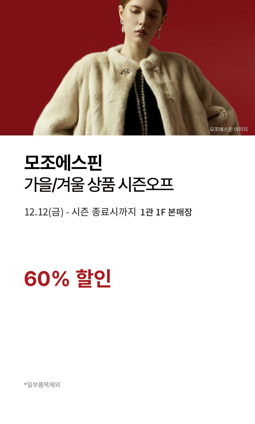 [모조에스핀] 가을/겨울 상품 시즌오프 기간 : 2025-12-12 ~ 시즌 종료 시까지 위치 : 1관 1F 본매장 ▲ [조이너스·꼼빠니아·비지트인뉴욕·SOUP] 여성복 인기브랜드 초특가전 ▼ [미샤] 가을/겨울 상품 시즌오프