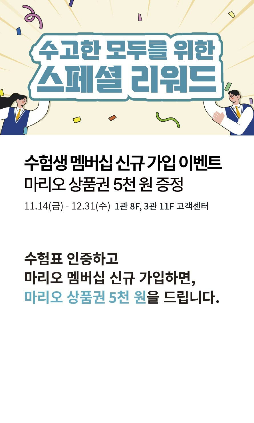 [이벤트] 수험생 멤버십 신규 가입 혜택 기간 : 2025-11-14 ~ 2025-12-31 위치 : 1관8F, 3관11F 고객센터 ▲ [이벤트] 마리오 느린 우체통 ▼ [무이자 할부] 12월 카드사 혜택