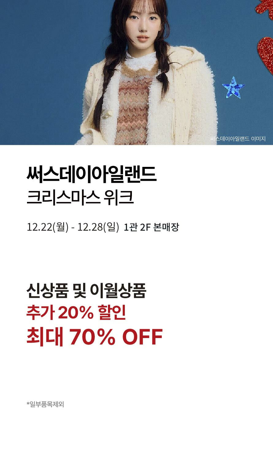 [써스데이아일랜드] 크리스마스 위크 기간 : 2025-12-22 ~ 2025-12-25 위치 : 1관 2F 본매장 ▲ [모조에스핀·미샤·미니멈] 가을/겨울 상품 60% OFF ▼ [트레몰로] 남성 겨울 코디 특별제안전