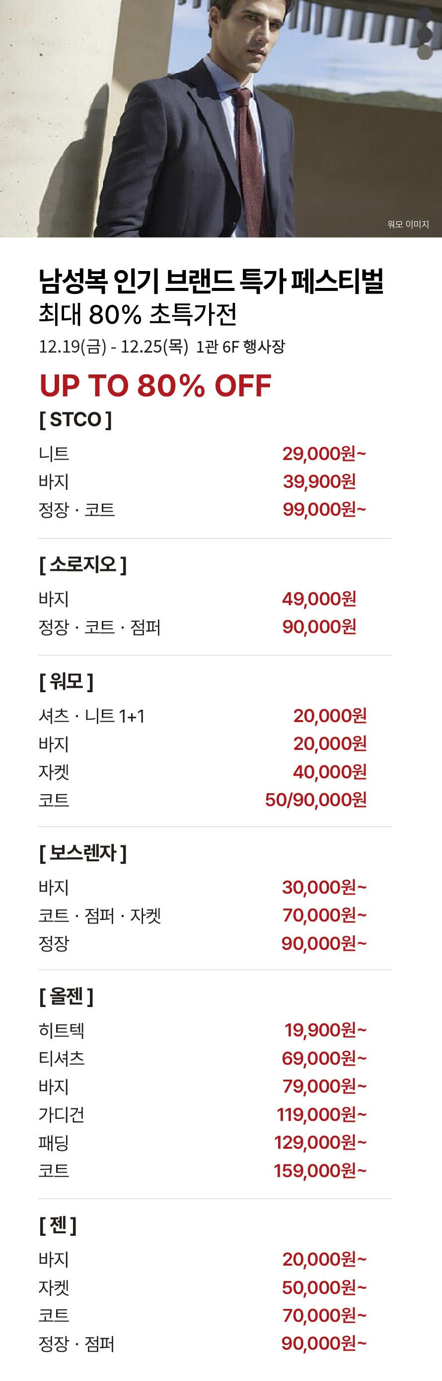 [인기 남성복 브랜드 특가 페스티벌] 최대 80% 초특가전 기간 : 2025-12-19 ~ 2025-12-25 위치 : 1관 6F 행사장 ▲ [기비키이스] 이월상품 특가전! ▼ [M.할리데이] 겨울 균일가 상품 大방출!