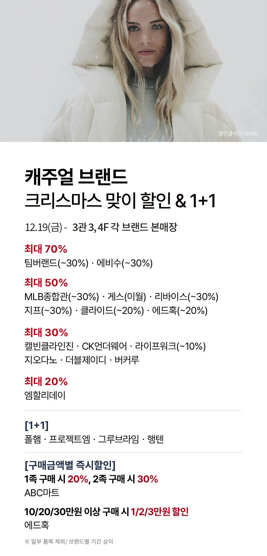 [캐주얼] 크리스마스 맞이 할인 & 1+1 기간 : 2025-12-19 ~ 각 브랜드 별 기간 상이 위치 : 3관 3/4F 각 브랜드 본매장 ▲ [오닐] 겨울 인기 의류 초특가 할인전 ▼ [캐주얼] 겨울 상품 초특가大전