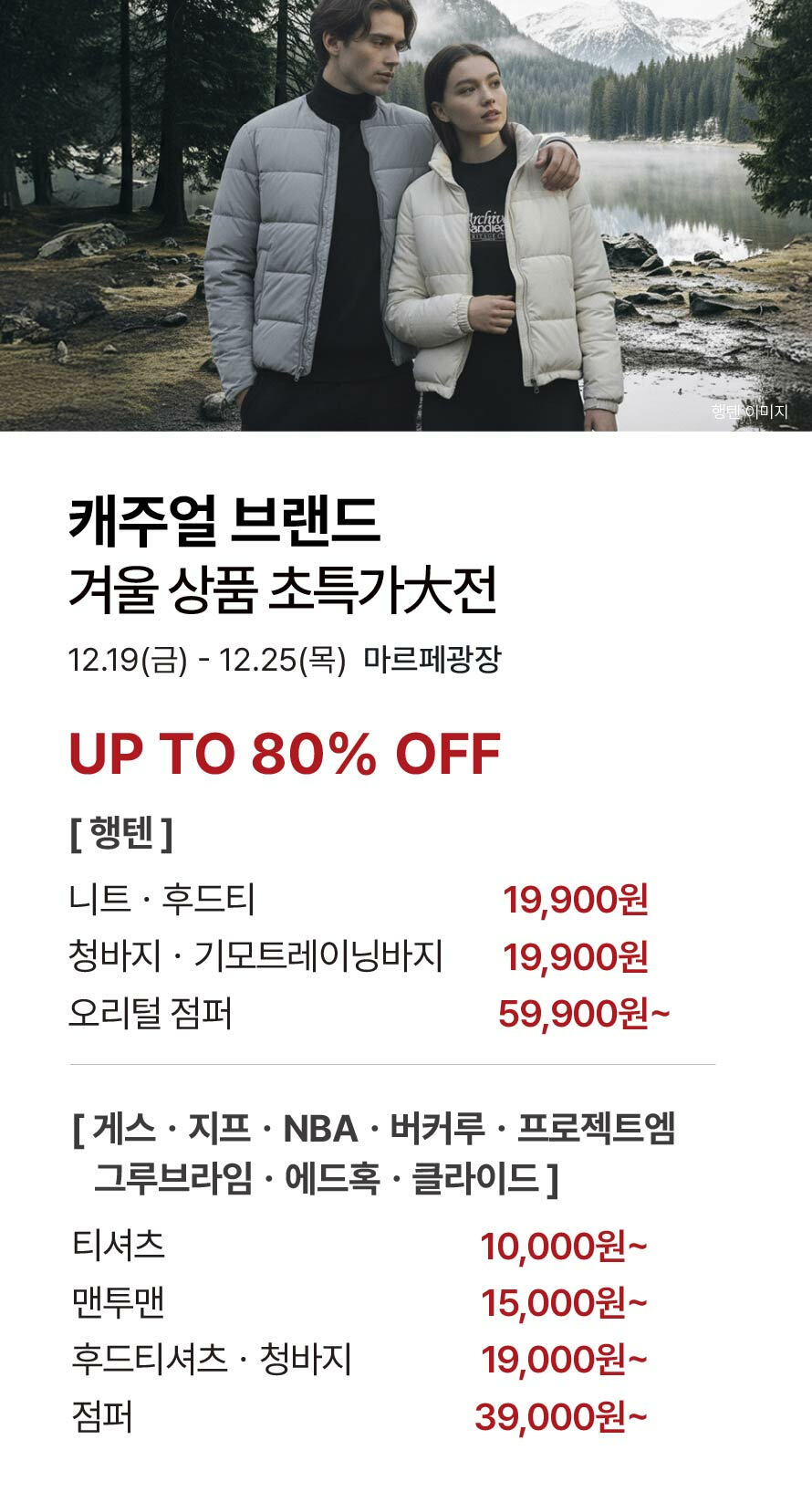 [캐주얼] 겨울 상품 초특가大전 기간 : 2025-12-19 ~ 2025-12-25 위치 : 마르페광장 ▲ [캐주얼] 크리스마스 맞이 할인 & 1+1 ▼ [무이자 할부] 12월 카드사 혜택