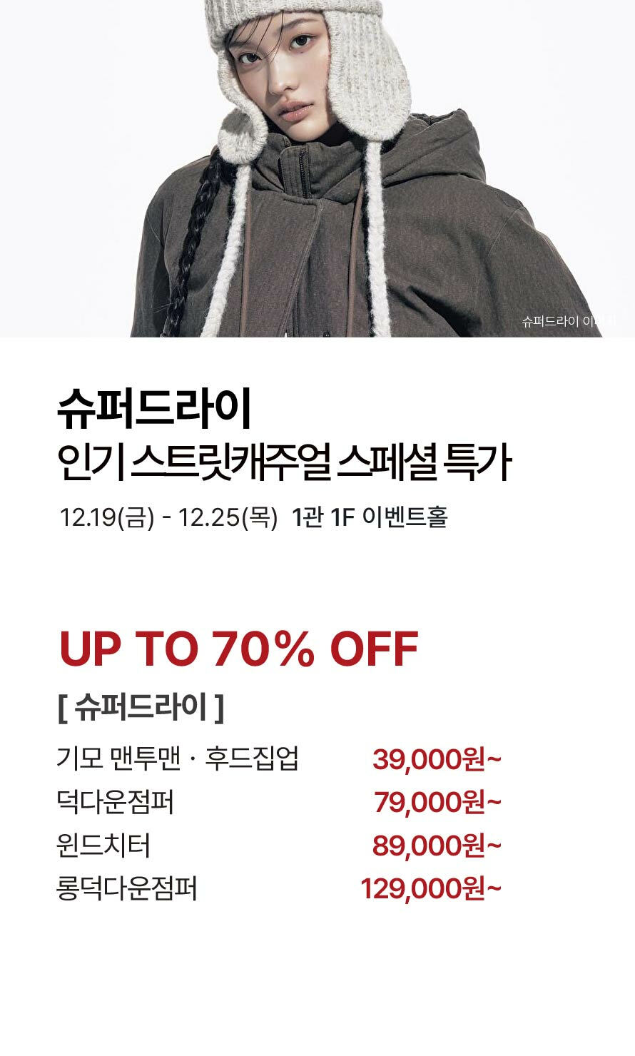 [슈퍼드라이] 인기 스트릿캐주얼 스페셜 특가 기간 : 2025-12-19 ~ 2025-12-25 위치 : 1관 1F 이벤트홀 ▲ [트레몰로] 남성 겨울 코디 특별제안전 ▼ [기비키이스] 이월상품 특가전!