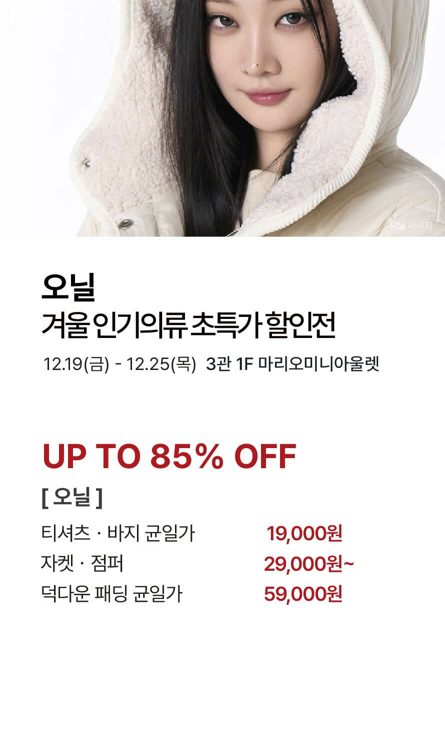 [오닐] 겨울 인기 의류 초특가 할인전 기간 : 2025-12-19 ~ 2025-12-25 위치 : 3관 1F 마리오미니아울렛 ▲ [M.할리데이] 겨울 균일가 상품 大방출! ▼ [캐주얼] 크리스마스 맞이 할인 & 1+1