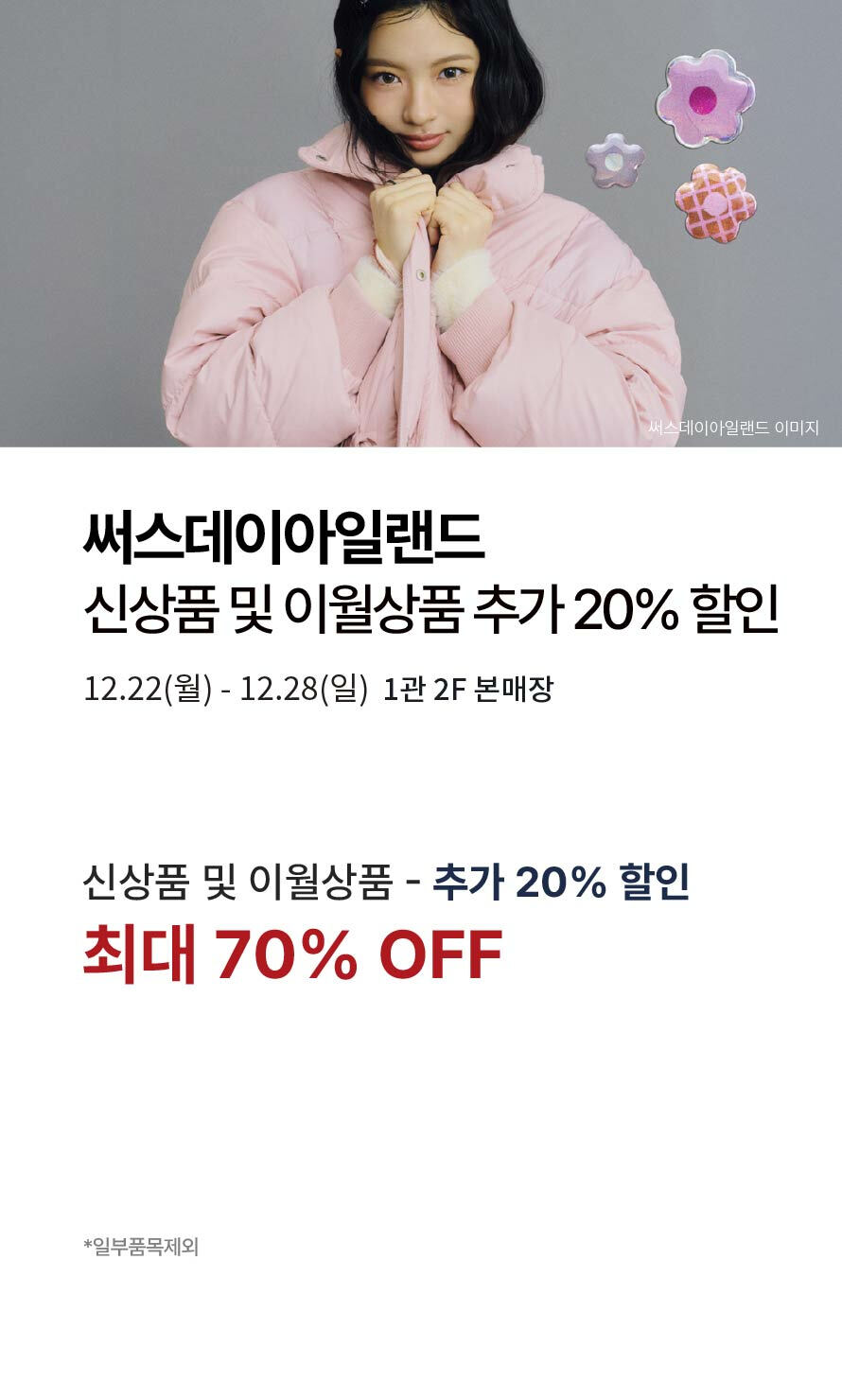 [써스데이아일랜드] 신상품 및 이월상품 추가 20% 할인 기간 : 2025-12-26 ~ 2025-12-28 위치 : 1관 2F 본매장 ▲ 대중교통 생활화 캠페인 다음글이 없습니다.