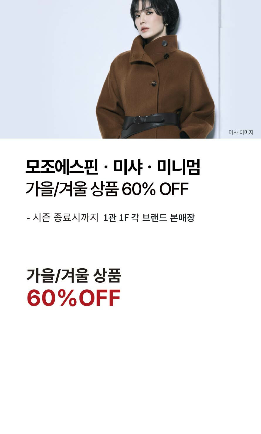 [모조에스핀·미샤·미니멈] 가을/겨울 상품 60% OFF 기간 : 2025-12-26 ~ 시즌 종료 시까지 위치 : 1관 1F 각 본매장 ▲ 대중교통 생활화 캠페인 다음글이 없습니다.