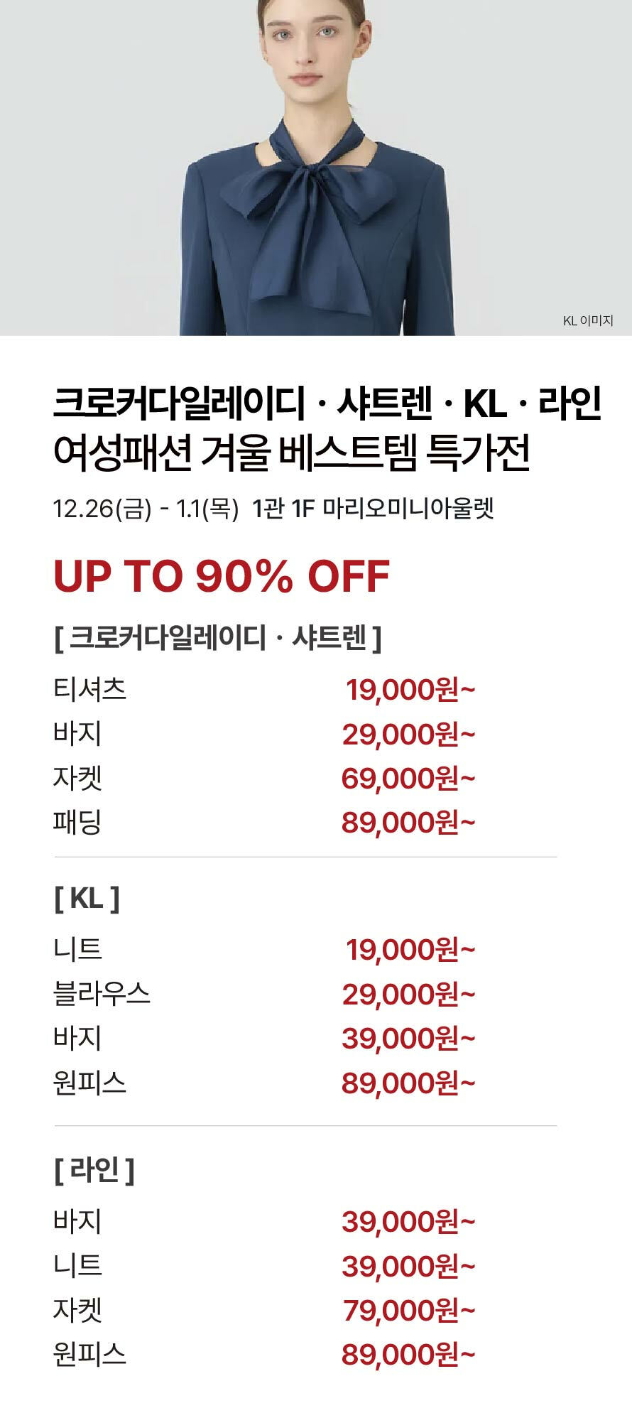 [크로커다일레이디·샤트렌·KL·라인] 여성패션 겨울 베스트템 특가전 기간 : 2025-12-26 ~ 2026-01-01 위치 : 1관 1F 마리오미니아울렛 ▲ 대중교통 생활화 캠페인 다음글이 없습니다.