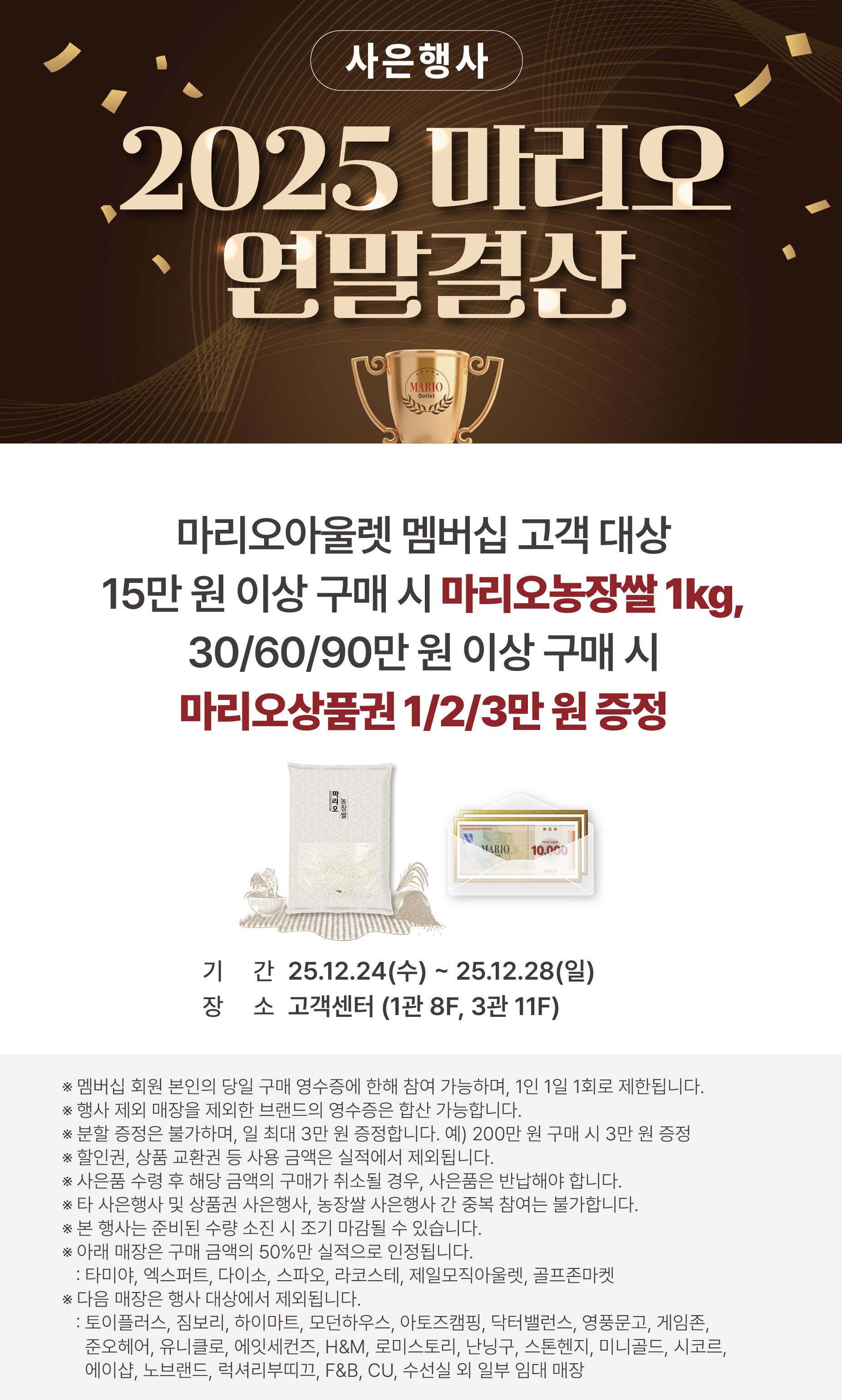 [2025 연말결산] 마지막 사은행사! 기간 : 2025-12-24 ~ 2025-12-28 위치 : 고객센터 (1관 8F, 3관 11F) 이전글이 없습니다. ▼ [이벤트] 크리스마스 산타 at Mario