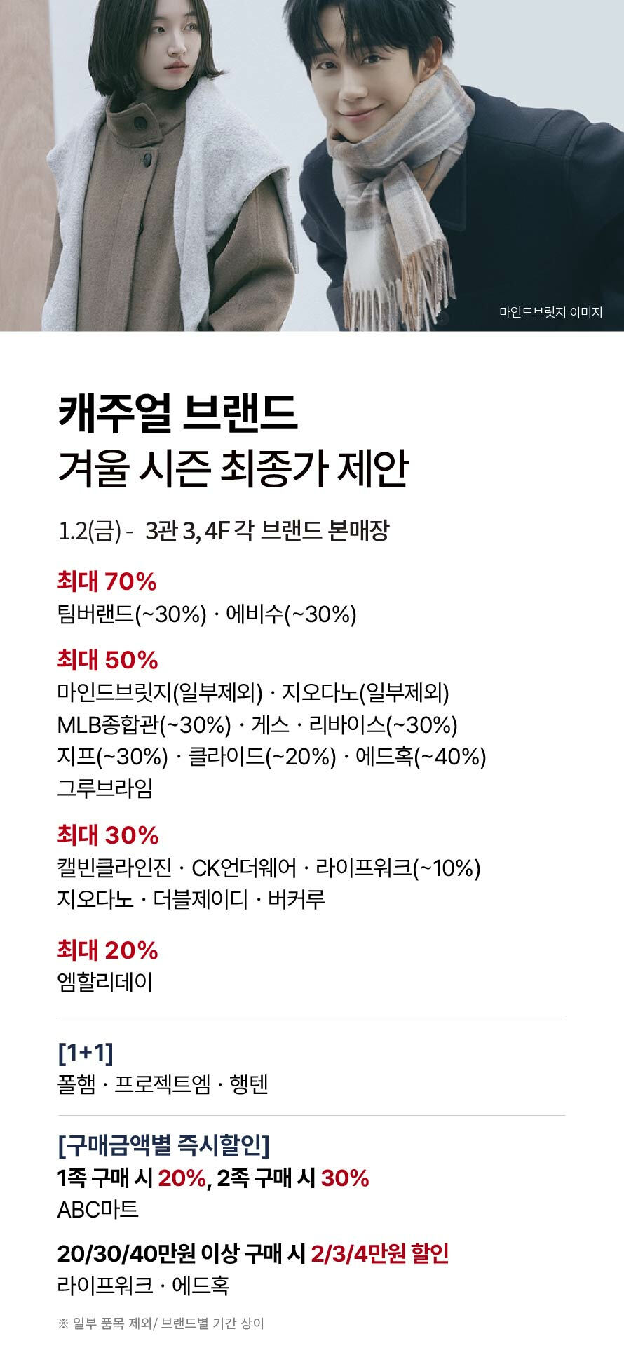 [캐주얼 브랜드] 겨울 시즌 최종가 제안! 기간 : 2026-01-02 ~ 각 브랜드 별 기간 상이 위치 : 3관 3/4F 각 브랜드 본매장 ▲ [캐주얼 브랜드] 겨울 상품 초특가 大전 ▼ [유·아동 브랜드] 겨울 시즌 최종가 제안