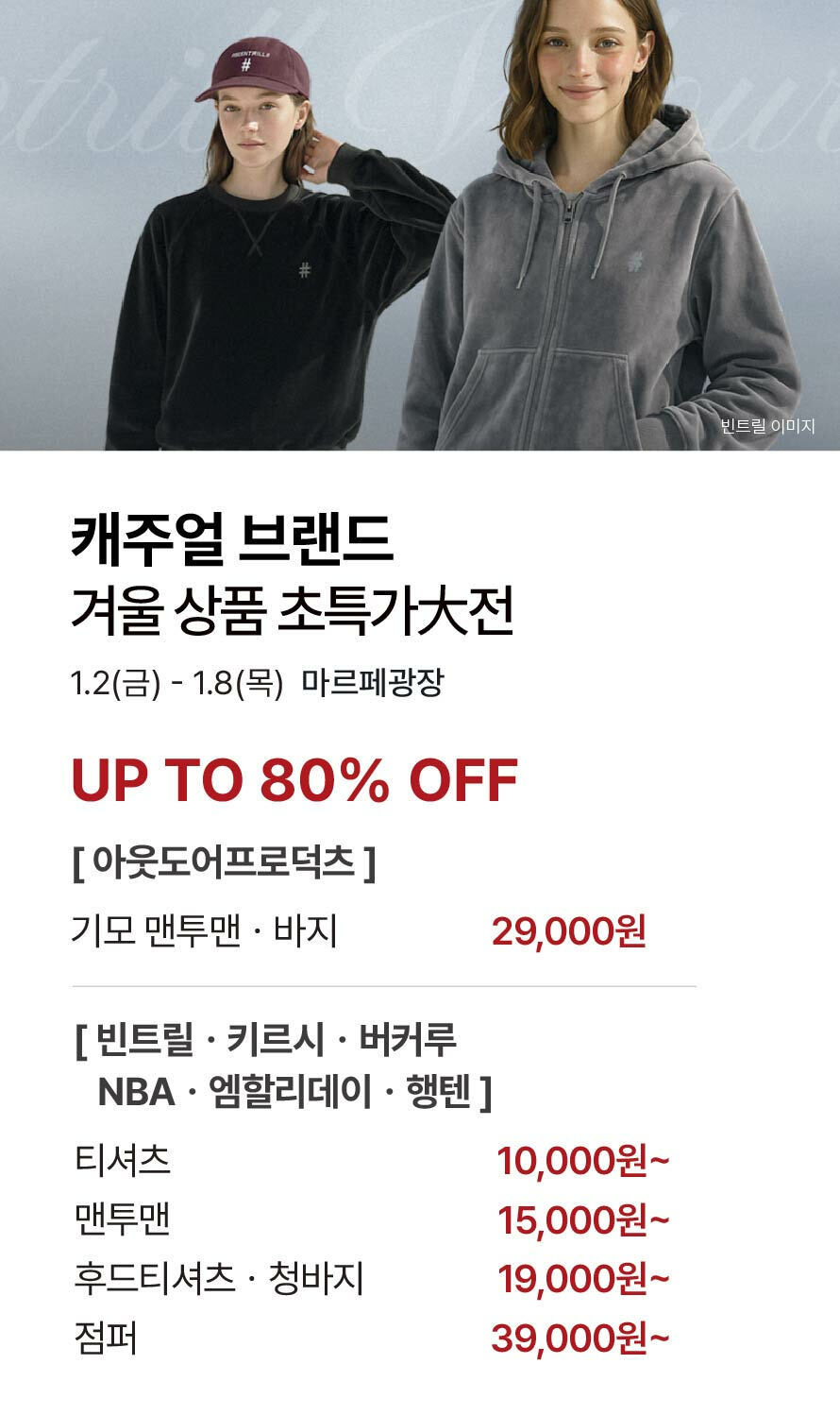 [캐주얼 브랜드] 겨울 상품 초특가 大전 기간 : 2026-01-02 ~ 2026-01-08 위치 : 마르페광장 ▲ [클라이드] 겨울 균일가 상품 大방출 ▼ [캐주얼 브랜드] 겨울 시즌 최종가 제안!