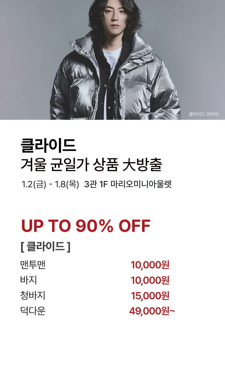 [클라이드] 겨울 균일가 상품 大방출 기간 : 2026-01-02 ~ 2026-01-08 위치 : 3관 1F 마리오미니아울렛 ▲ 2025년 12월 마리오아울렛 X 마리오게임빌리지연천 경품행사 당첨자 발표 다음글이 없습니다.