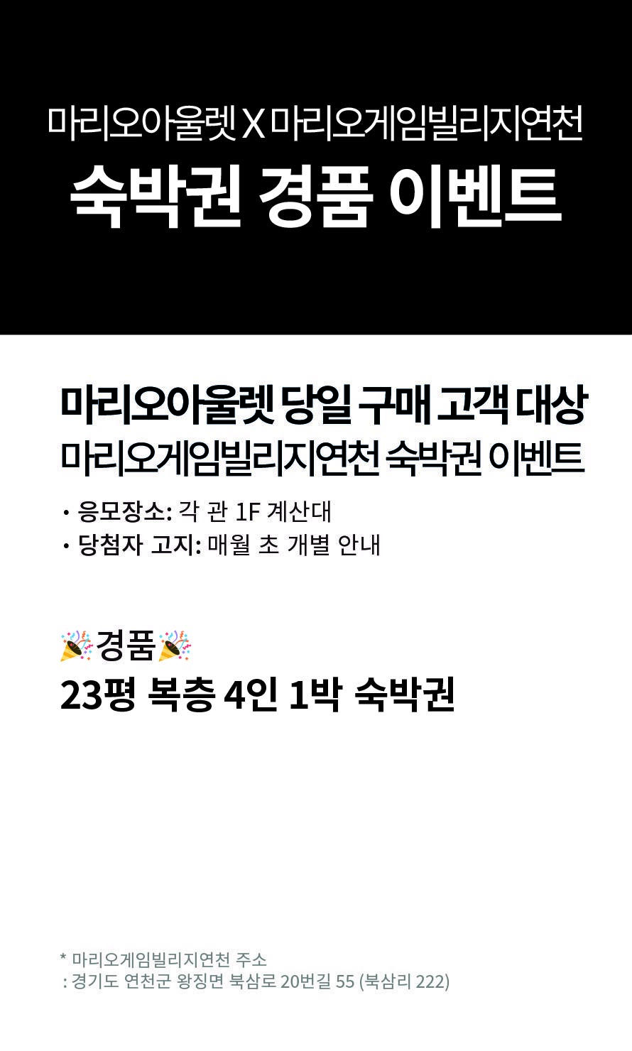 마리오게임빌리지연천 펜션 숙박권 이벤트 기간 : 매월 초 개별 안내 위치 : 각 관 1F 계산대 ▲ 마리오아울렛 1월 무이자 할부 혜택 ▼ 2025년 12월 마리오아울렛 X 마리오게임빌리지연천 경품행사 당첨자 발표
