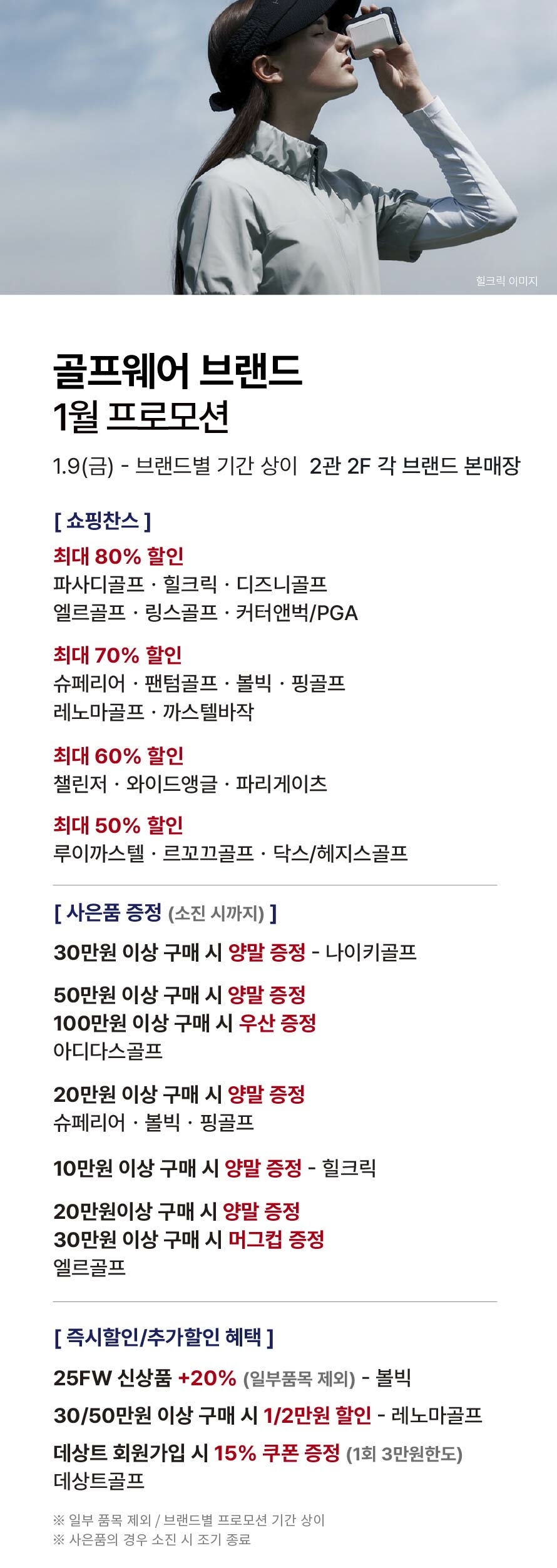 [골프웨어 브랜드] 1월 프로모션 기간 : 2026-01-09 ~ 각 브랜드 별 기간 상이 위치 : 2관 2F 각 본매장 ▲ [리틀밥독] 키즈 겨울 균일가 제안 ▼ [아디다스 팩토리] 금액할인 프로모션