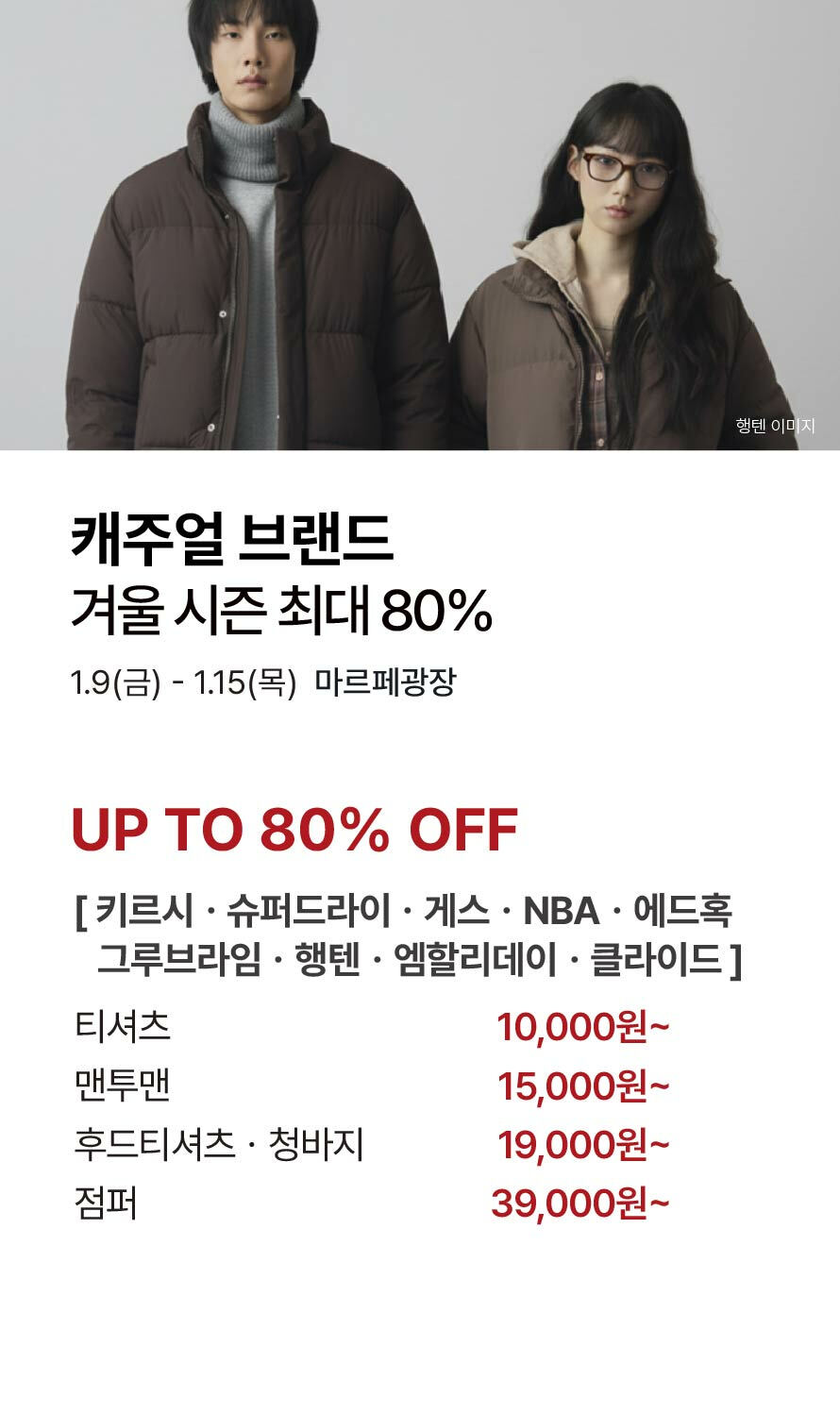 [캐주얼 브랜드] 겨울 시즌 최대 80% 기간 : 2026-01-09 ~ 2026-01-15 위치 : 마르페광장 ▲ [엘르침구] 겨울 침구 최대 70% ▼ [캐주얼 브랜드] 겨울 시즌 최종가 제안