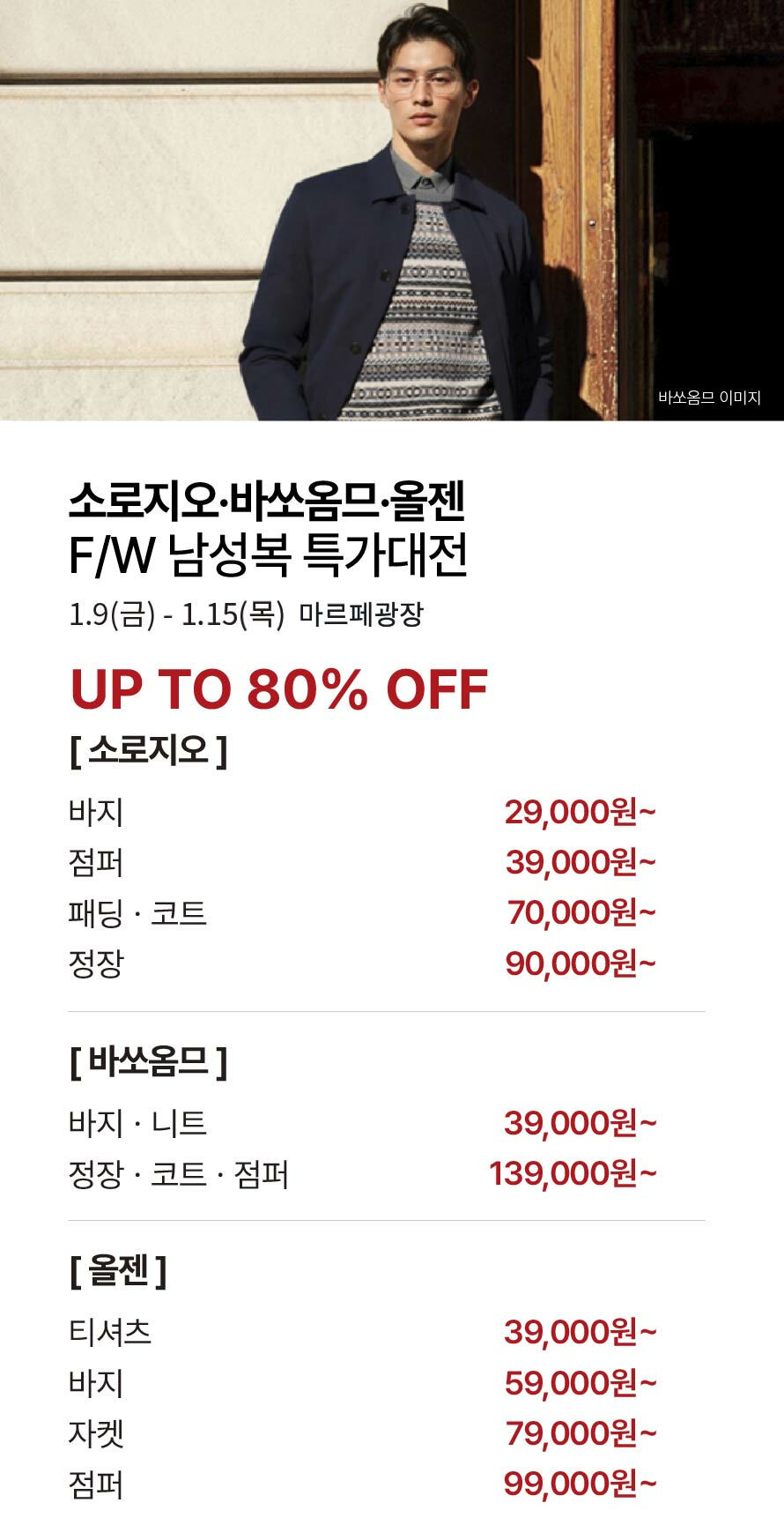 [소로지오·바쏘옴므·올젠] F/W 남성복 특가대전 기간 : 2026-01-09 ~ 2026-01-15 위치 : 마르페광장 ▲ [남성복 인기 브랜드 페스티벌] 최대 80% 초특가전 ▼ [아웃도어 브랜드] 1월 프로모션