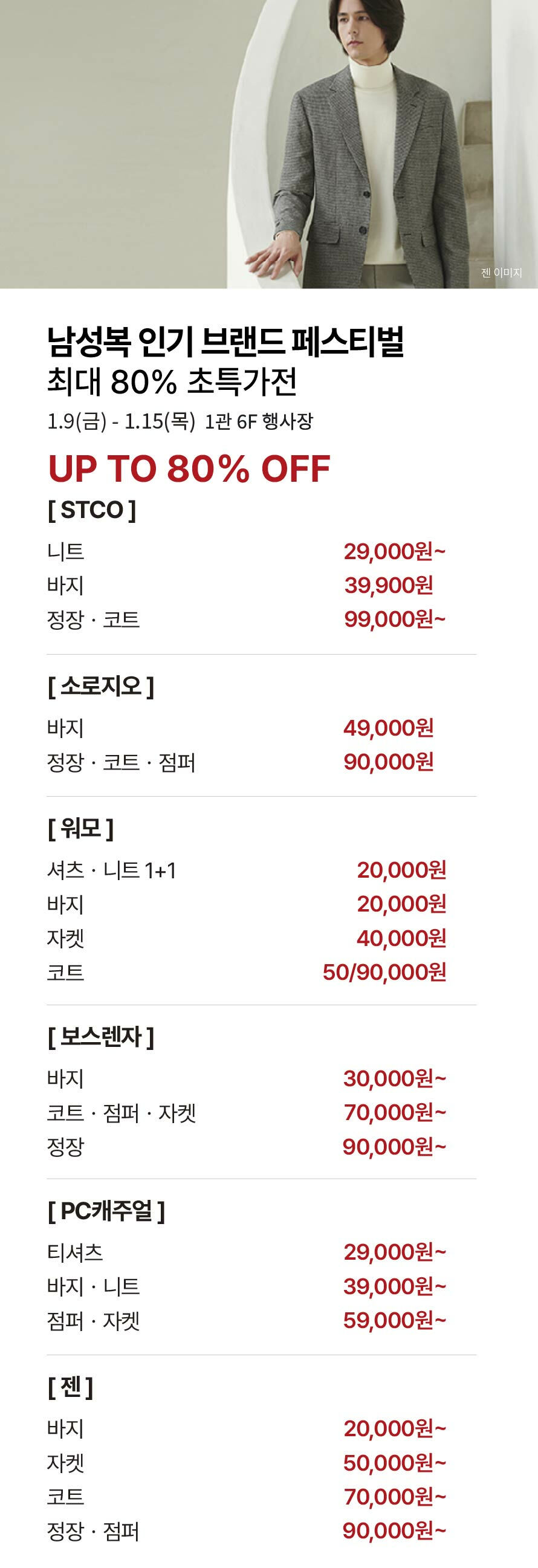 [남성복 인기 브랜드 페스티벌] 최대 80% 초특가전 기간 : 2026-01-09 ~ 2026-01-15 위치 : 1관 6F 행사장 ▲ [나인마이너스2] 인기 의류 초특가 할인전 ▼ [소로지오·바쏘옴므·올젠] F/W 남성복 특가대전