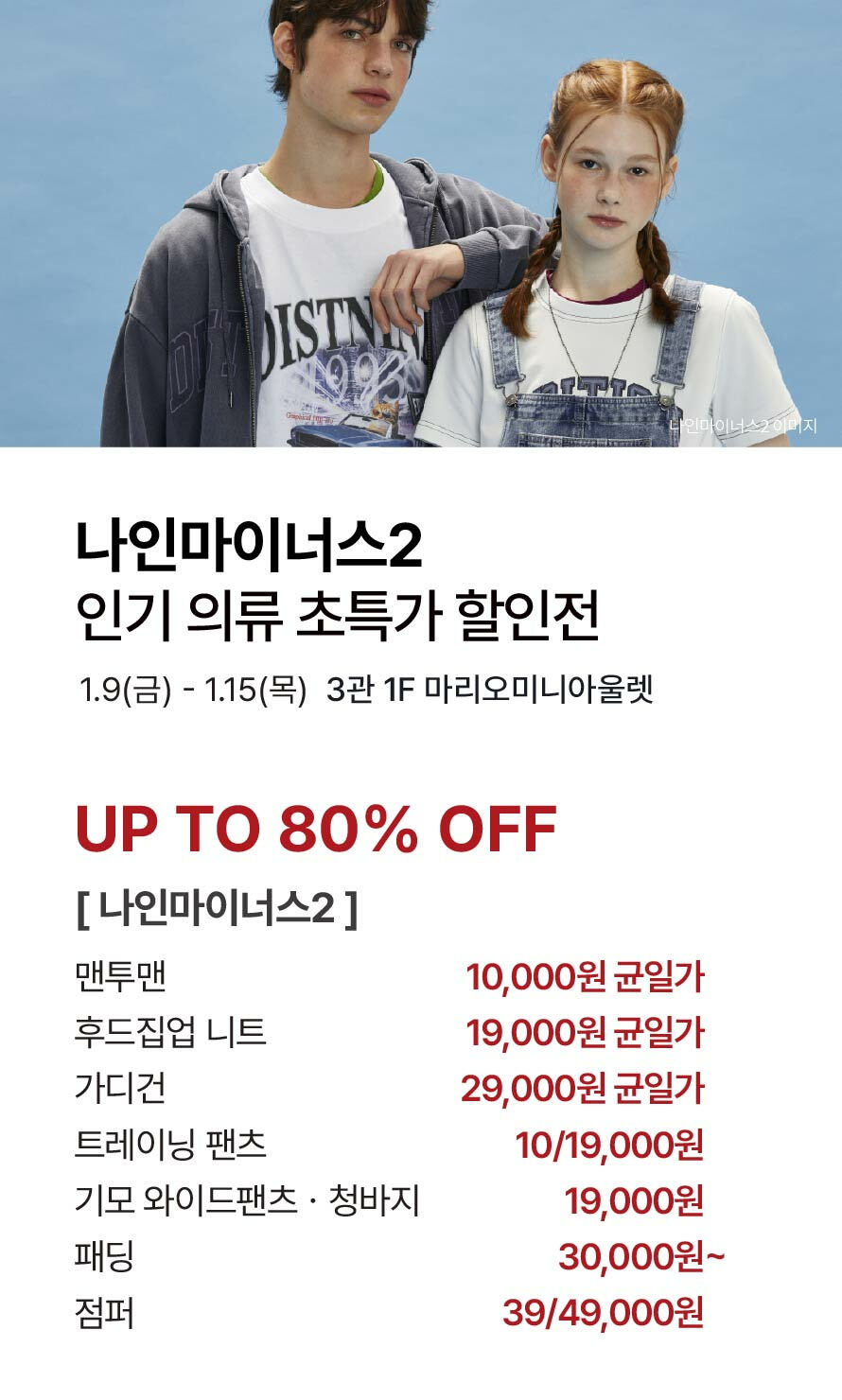 [나인마이너스2] 인기 의류 초특가 할인전 기간 : 2026-01-09 ~ 2026-01-15 위치 : 3관 1F 마리오미니아울렛 ▲ [POP UP] 악세서리 브랜드 '젬아띠' 팝업 스토어 오픈 ▼ [남성복 인기 브랜드 페스티벌] 최대 80% 초특가전