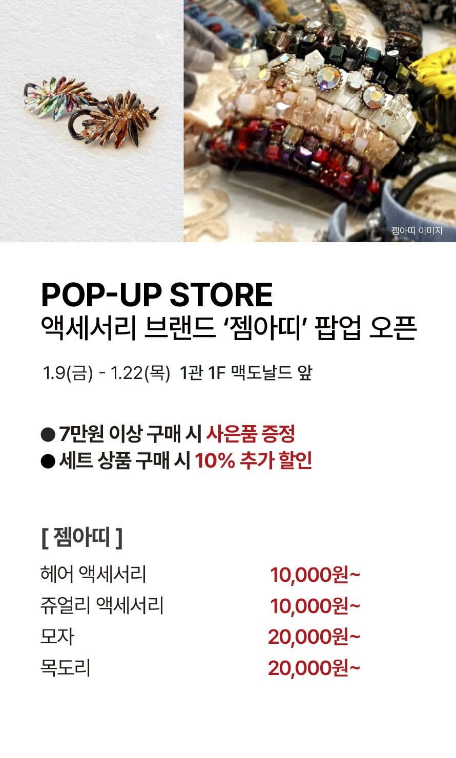 [POP UP] 악세서리 브랜드 '젬아띠' 팝업 스토어 오픈 기간 : 2026-01-09 ~ 2026-01-22 위치 : 1관 1F 맥도날드 앞 ▲ [지고트·아이잗컬렉션] 바바패션 여성캐릭터 특집전 ▼ [나인마이너스2] 인기 의류 초특가 할인전