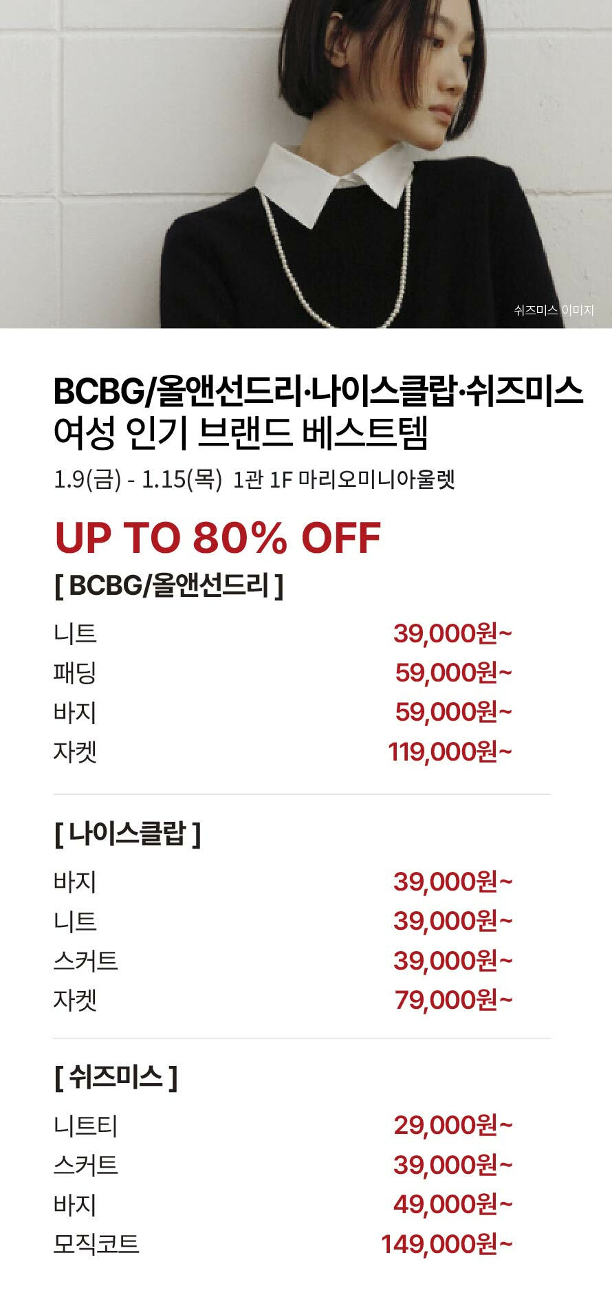 [BCBG/올앤선드리·나이스클랍·쉬즈미스] 여성 인기브랜드 베스트템 기간 : 2026-01-09 ~ 2026-01-15 위치 : 1관 1F 마리오미니아울렛 ▲ [지프·폴햄] 겨울 시즌 최종가 상품전 ▼ [지고트·아이잗컬렉션] 바바패션 여성캐릭터 특집전