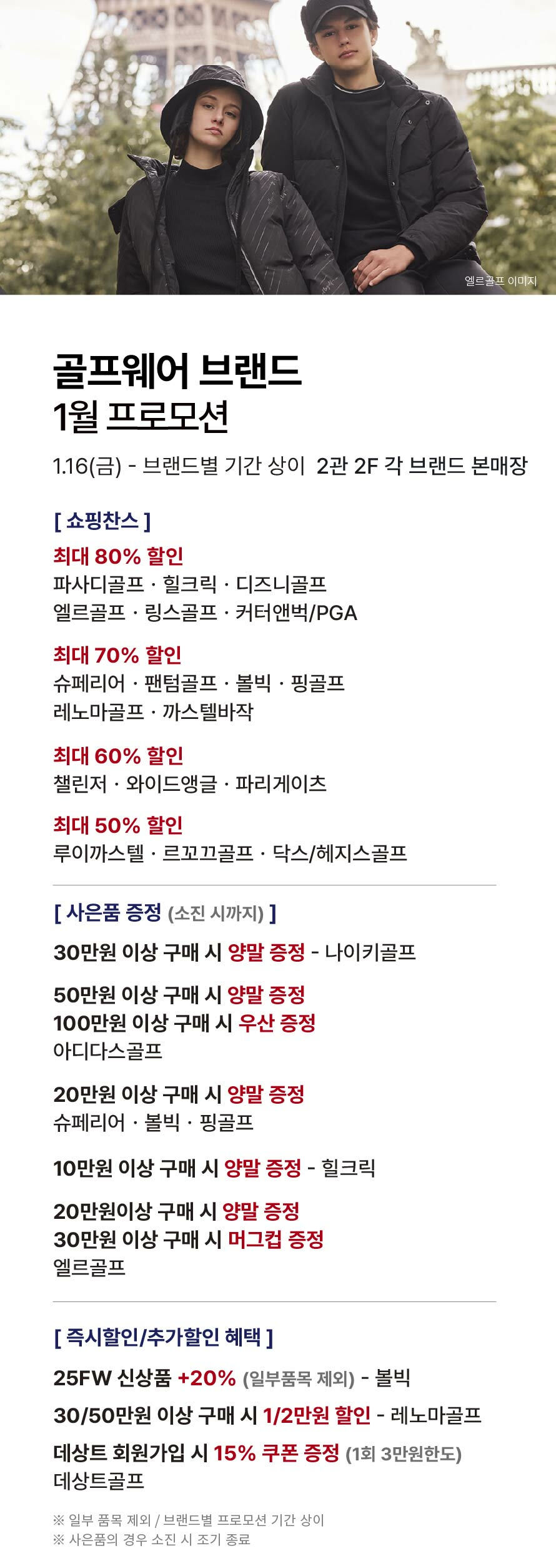 [골프웨어 브랜드] 1월 프로모션 기간 : 2026-01-16 ~ 각 브랜드 별 기간 상이 위치 : 2관 2F 각 본매장 ▲ 미리 준비하는 신학기 책가방 특별전 ▼ [젝시믹스] 윈터세일
