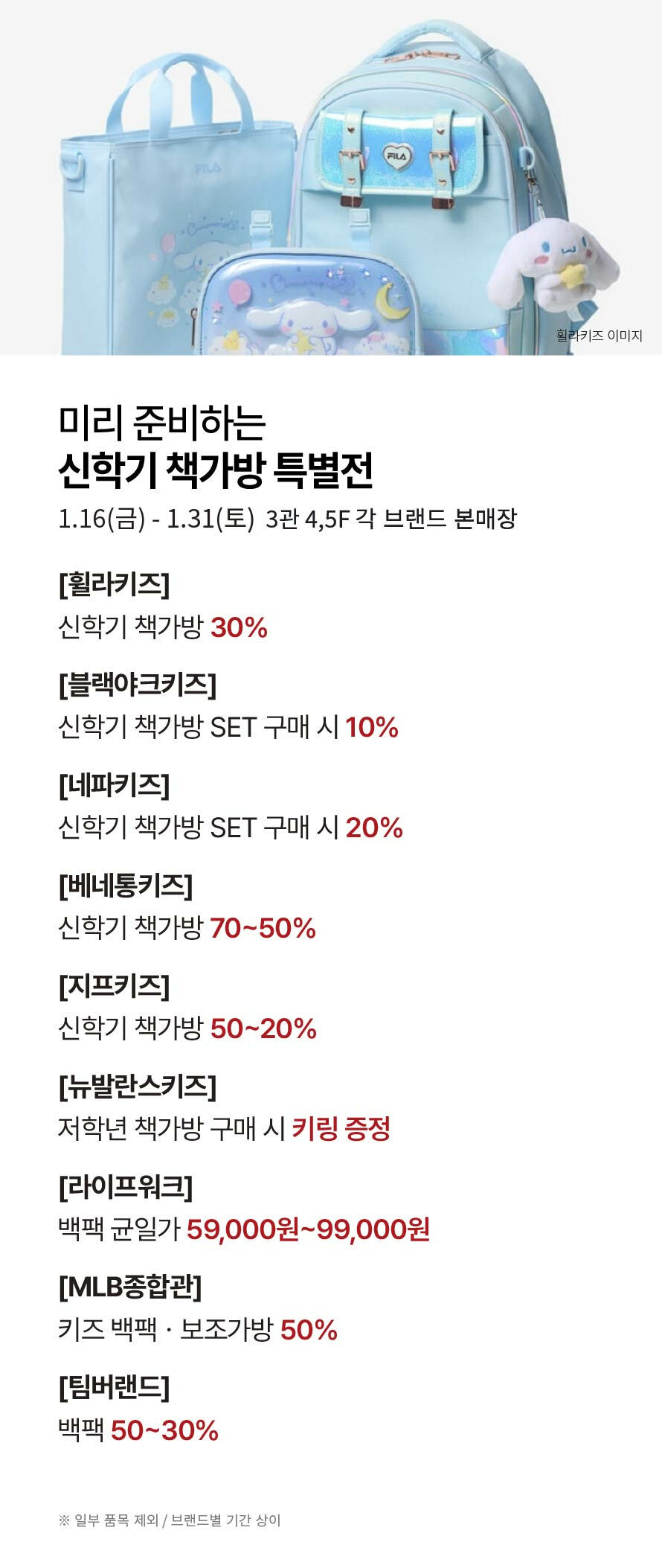미리 준비하는 신학기 책가방 특별전 기간 : 2026-01-16 ~ 각 브랜드 별 기간 상이 위치 : 3관 4·5F 각 본매장 ▲ [유·아동 브랜드] 겨울 시즌 최종가 제안! ▼ [골프웨어 브랜드] 1월 프로모션