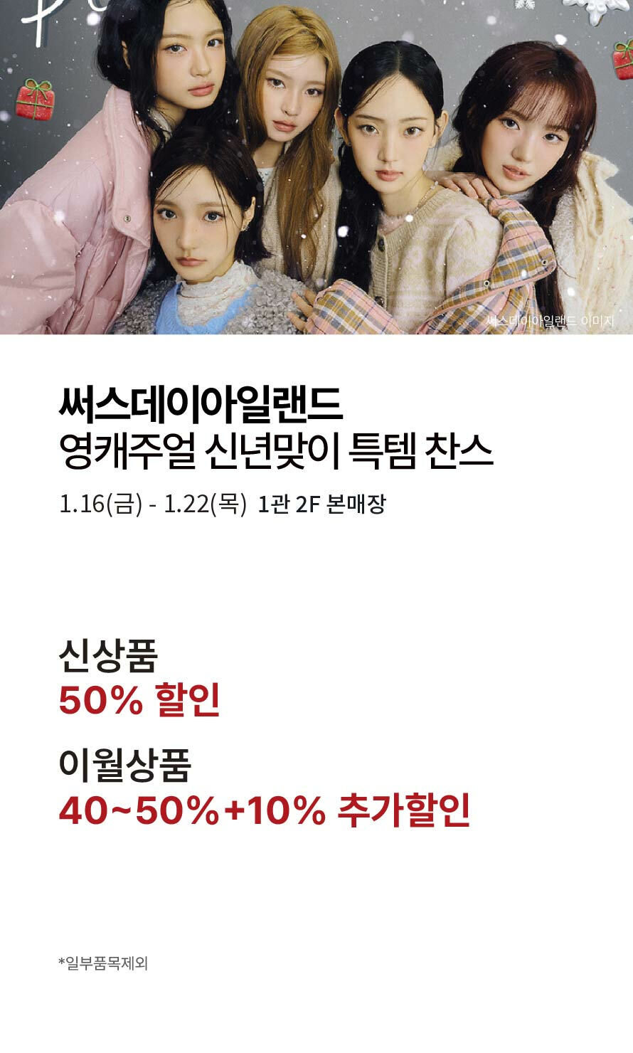[써스데이아일랜드] 영캐주얼 신년맞이 득템 찬스 기간 : 2026-01-16 ~ 2026-01-22 위치 : 1관 2F 본매장 ▲ [에고이스트·CC콜렉트·오프리미츠] 여성패션 F/W 베스트템 특가전 ▼ [BCBG·올앤선드리] 겨울상품 클리어런스