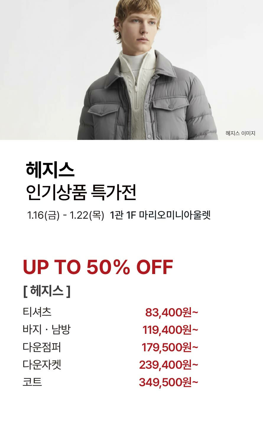 [헤지스] 인기상품 특가전 기간 : 2026-01-16 ~ 2026-01-22 위치 : 1관 1F 마리오미니아울렛 ▲ [BCBG·올앤선드리] 겨울상품 클리어런스 ▼ [라코스테] 의류·신발 균일가 프로모션