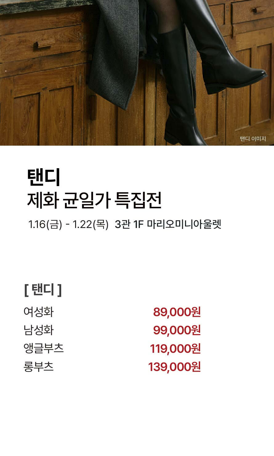 [탠디] 제화 균일가 특집전 기간 : 2026-01-16 ~ 2026-01-22 위치 : 3관 1F 마리오미니아울렛 ▲ [스톤헨지] 1월 특별가격 인기아이템 추천 ▼ [아디다스 팩토리] 추가할인 프로모션