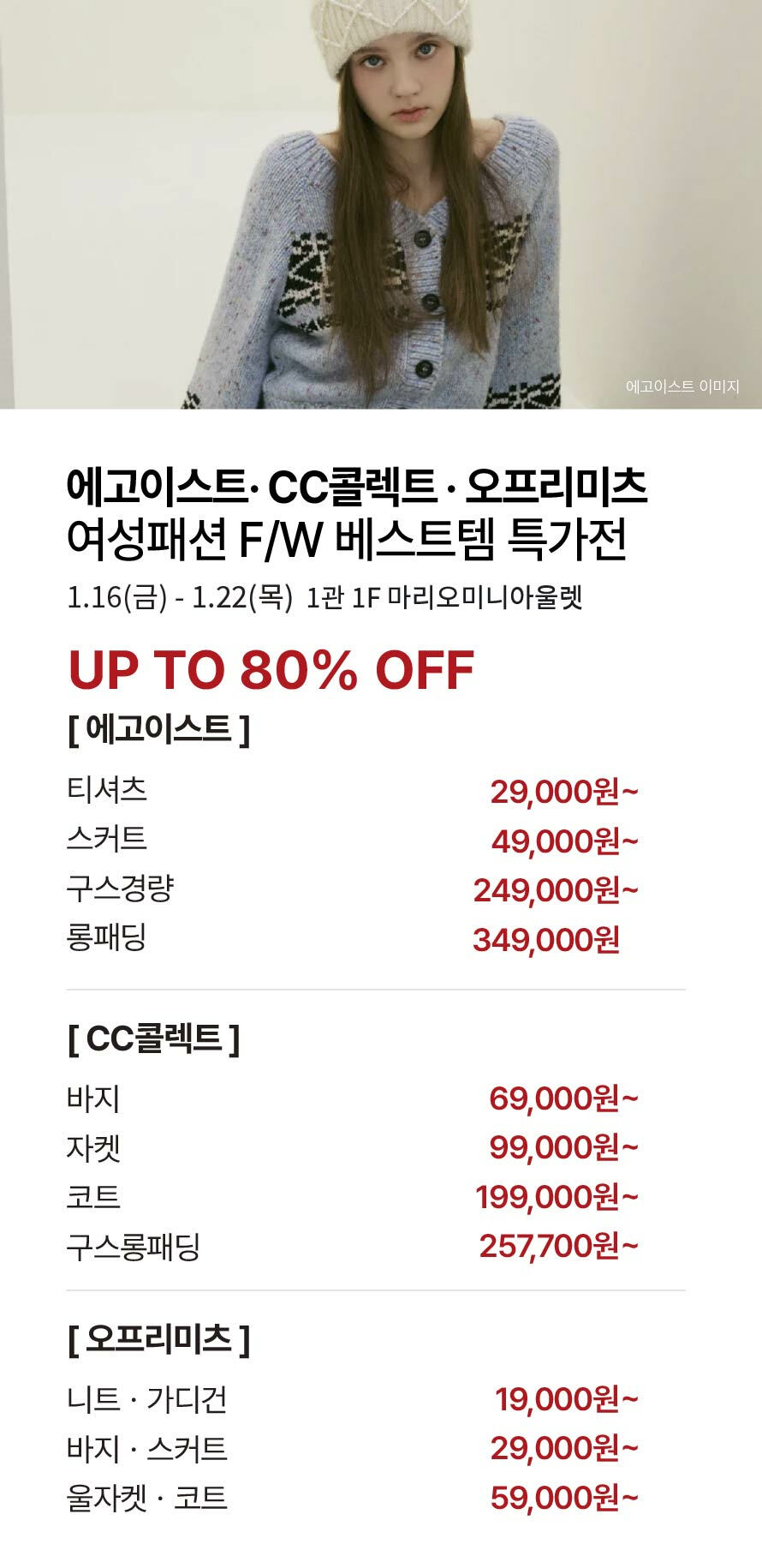 [에고이스트·CC콜렉트·오프리미츠] 여성패션 F/W 베스트템 특가전 기간 : 2026-01-16 ~ 2026-01-22 위치 : 1관 1F 마리오미니아울렛 ▲ [아디다스 팩토리] 추가할인 프로모션 ▼ [써스데이아일랜드] 영캐주얼 신년맞이 득템 찬스