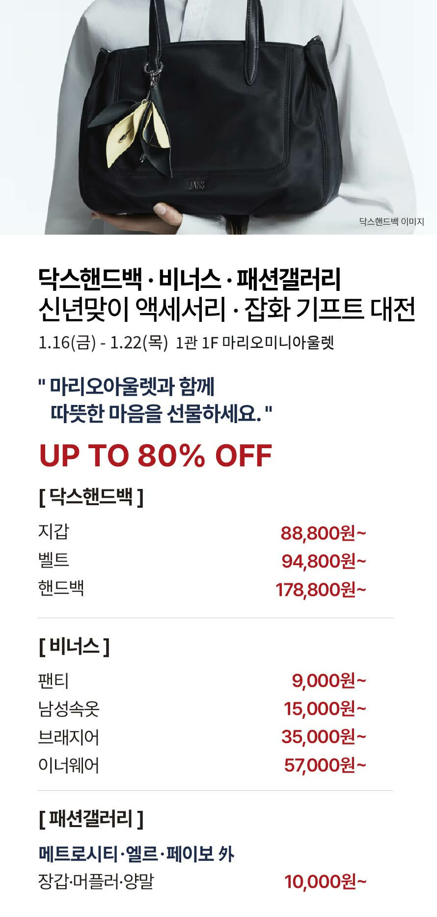 [닥스핸드백·비너스·패션갤러리] 신년맞이 액세서리·잡화 기프트 대전 기간 : 2026-01-16 ~ 2026-01-22 위치 : 1관 1F 마리오미니아울렛 ▲ 마리오게임빌리지연천 펜션 숙박권 이벤트 ▼ [럭셔리부띠끄] 1월 특별가격 인기아이템 추천