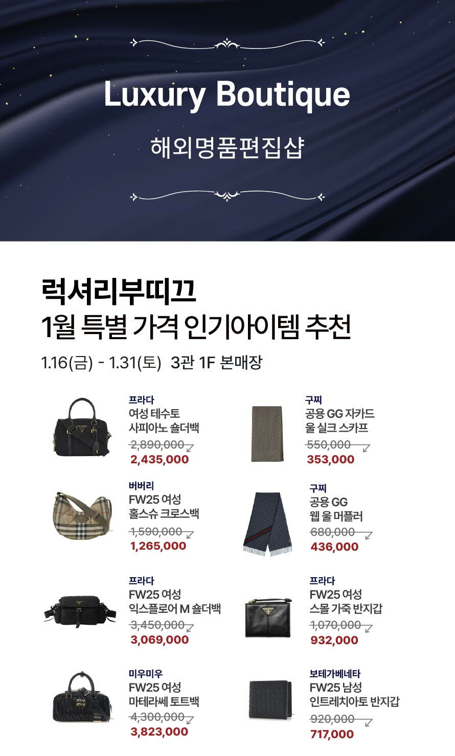 [럭셔리부띠끄] 1월 특별가격 인기아이템 추천 기간 : 2026-01-16 ~ 2026-01-31 위치 : 3관 1F 본매장 ▲ [닥스핸드백·비너스·패션갤러리] 신년맞이 액세서리·잡화 기프트 대전 ▼ [스톤헨지] 1월 특별가격 인기아이템 추천