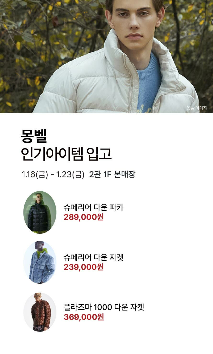 [몽벨] 인기아이템 입고 기간 : 2026-01-16 ~ 2026-01-23 위치 : 2관 1F 본매장 ▲ [밀레·블랙야크] 인기 겨울 아웃도어 특가전 ▼ [아웃도어 브랜드] 1월 프로모션