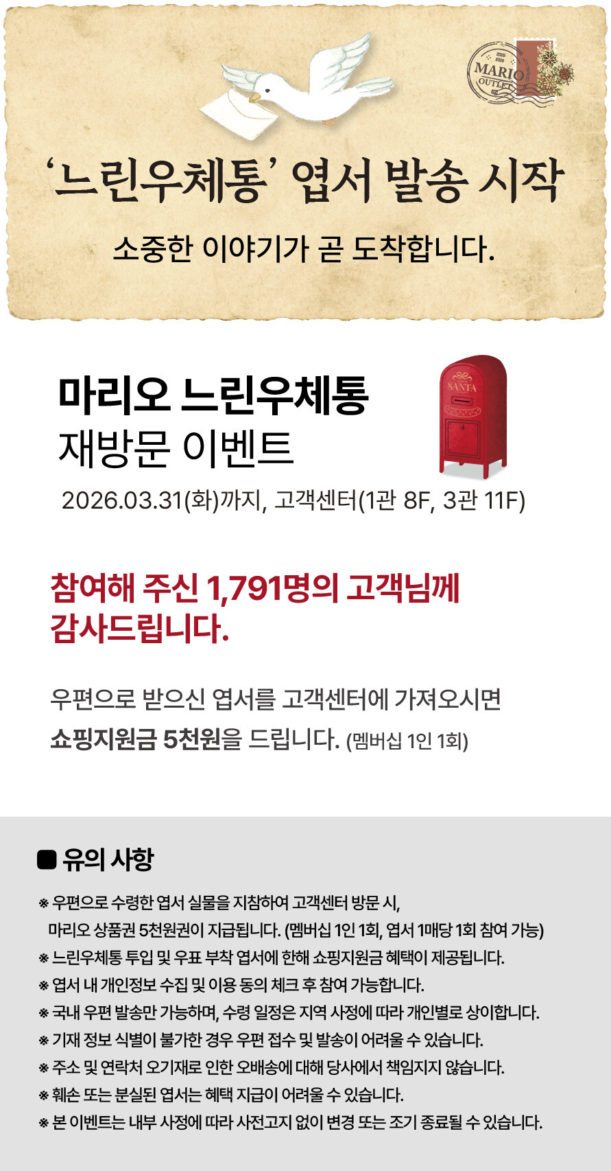 [느린우체통] 엽서 발송 시작! 기간 : ~ 2026-03-31 까지 위치 : 고객센터 (1관 8F, 3관 11F) ▲ 응답하라 마리오 추억 공모전 ▼ 마리오게임빌리지연천 펜션 숙박권 이벤트